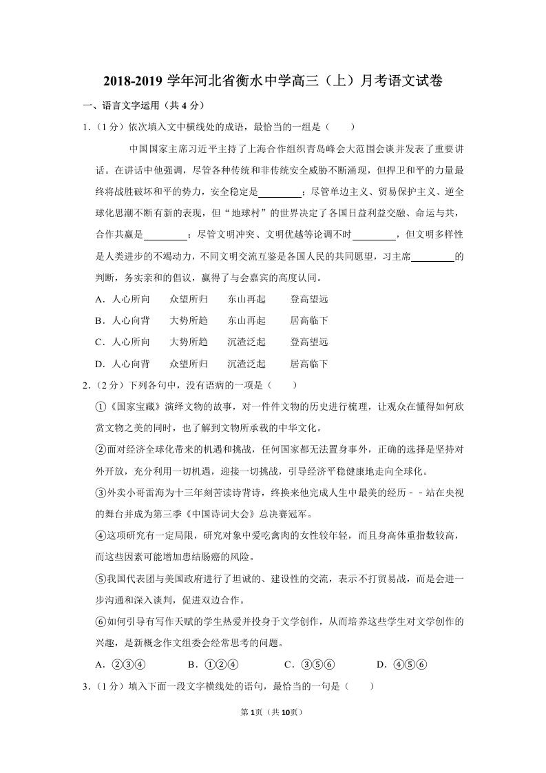 2018-2019学年河北省衡水中学高三(上)月考语文试卷(原卷版)