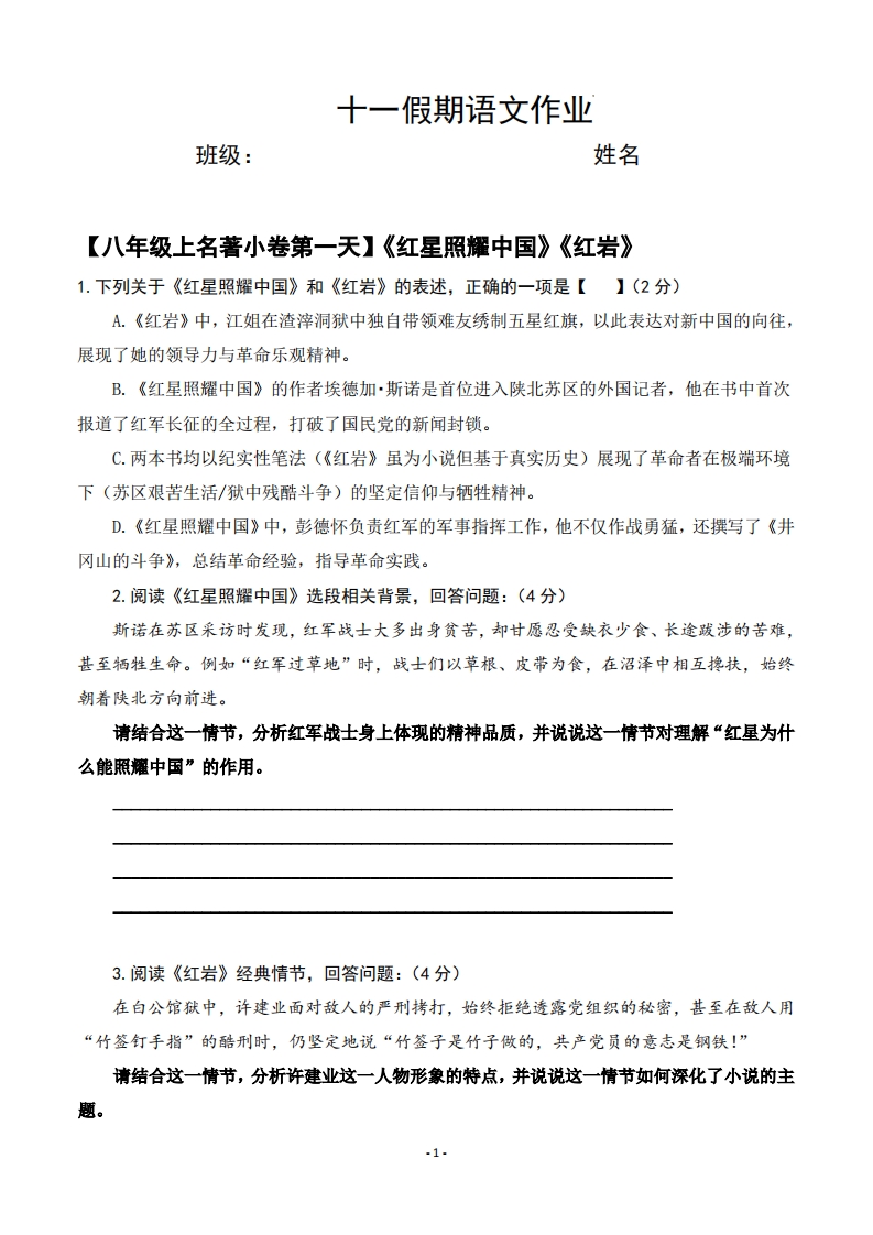 学生啦:十一假期语文作业班级:姓名【八年级上名著小卷第一天】《红星照耀中国》《红岩》1.下列关于《红星照耀中国》和《红岩》的表述,正确的一项是【】(2分)A.《红岩》中,江姐在渣滓洞狱中独自带领难友绣制五星红旗,以此表达对新中国的向往,展现了她的领导力与革命乐观精神。B.《红星照耀中国》的作者埃德加·斯诺是首位进入陕北苏区的外国记者,他在书中首次报道了红军长征的全过程,打破了国民党的新闻封锁。C.两本书均以纪实性笔法(《红岩》虽为小说但基于真实历史)展现了革命者在极端环境下(苏区艰苦生活/狱中残酷斗争)的坚定信仰与牺牲精神。D.《红星照耀中国》中,彭德怀负责红军的军事指挥工作,他不仅作战勇猛,还撰写了《井冈山的斗争》,总结革命经验,指导革命实践。2.阅读《红星照耀中国》选段相关背景,回答问题:(4分)斯诺在苏区采访时发现,红军战士大多出身贫苦,却甘愿忍受缺衣少食、长途跋涉的苦难,甚至牺牲生命。例如“红军过草地”时,战士们以草根、皮带为食,在沼泽中相互搀扶,始终朝着陕北方向前进。请结合这一情节,分析红军战士身上体现的精神品质,并说说这一情节对理解“红星为什么能照耀中国”的作用。3.阅读《红岩》经典情节,回答问题:(4分)在白公馆狱中,许建业面对敌人的严刑拷打,始终拒绝透露党组织的秘密,甚至在敌人用“竹签钉手指”的酷刑时,仍坚定地说“竹签子是竹子做的,共产党员的意志是钢铁!”请结合这一情节,分析许建业这一人物形象的特点,并说说这一情节如何深化了小说的主题。