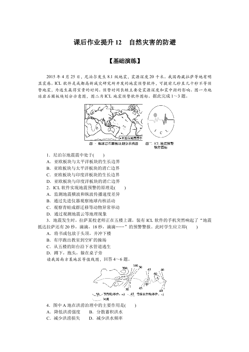 学生啦:课后作业提升12自然灾害的防避【基础演练】2015年4月25日,尼泊尔发生8.1级地震,震源深度20千米。我国西藏拉萨等地有明显震感。CL软件是成都高新减灾研究所开发的地震预警软件,可提前几秒至几十秒不等预警地震,为逃生赢得宝贵的时间。预警时间长短主要受震源深度和震中距的影响。图一为地球岩石圈板块划分示意图,图二为CL地震预警软件图标。据此完成1一3题。1.尼泊尔地震震中处于()A.亚欧板块与太平洋板块的生长边界B.亚欧板块与太平洋板块的消亡边界C.亚欧板块与印度洋板块的生长边界D.亚欧板块与印度洋板块的消亡边界2.ICL软件实现地震预警的原理是()A.监测地震横波和纵波传播速度差异B.通过先进仪器观察地球内核活动C.观察青蛙成群迁移等动物异常举动D.通过观测地震云等地理现象3.地震发生时,拉萨某校老师正在五楼上课,装有ICL软件的手机突然响起了“地震抵达拉萨还有20秒,滴滴,18秒,滴滴…”的预警警报。此时学生应立即()A.将书或包放于头顶,并冲下楼B.有序跑出教室到空旷的操场C.从五楼的阳台沿下水管道逃生D.蹲下,抱头,躲在桌子旁读我国南方某地区等值线图,回答4一6题。45444.图中A地在洪涝治理中的主要作用是(A.降低洪涝强度B.分散蓄积洪水C.减少洪涝损失D.减少洪水频率