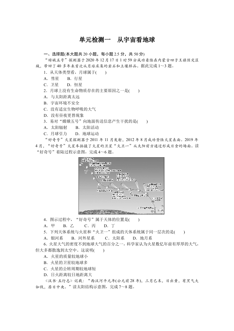 学生啦:单元检测一从宇宙看地球一、选择题(本大题共20小题,每小题2.5分,共50分)“嫦娥五号”探测器于2020年12月17日1时59分成功着陆在内蒙古四子王旗预定区域,带回了40多年来首次从月球采集的岩石和土壤样品。据此完成1~3题。1.从天体类型看,月球属于()A.彗星B.行星C.卫星D.恒星2.月球上没有生命物质存在的主要原因之一是(A.与太阳距离太远B.宇宙环境不安全C.没有适宜生物呼吸的大气D.没有昼夜更替现象3.易对“嫦娥五号”向地面传送信息产生干扰的是()A.太阳辐射B.太阳活动C.月球引力D.地球运动“好奇号”火星探测器于2011年11月发射,2012年8月成功登陆火星表面。2019年4月,“好奇号”火星车拍摄了火星的卫星“火卫一”从太阳前方通过形成日食的场面。读“好奇号”着陆过程示意图,完成4一6题。4.图示过程中,“好奇号”属于天体的位置是(A.甲B.乙C.丙D.丁5.下列天体系统与火星和“火卫一”组成的天体系统属于同一层次的是()A.银河系B.河外星系C.太阳系D.地月系6.火星大气的密度不到地球大气的百分之一,科学家认为火星数亿年前有厚厚的大气,但大多都散逸到太空中。这说明(A,火星的质量较地球小B.火星的卫星较地球多C.火星的公转周期较地球短D.日火距离较日地距离大《汉书·五行志》记载:“西汉河平元年(公元前28年),三月已末,日出黄,有黑气大如钱,居日中央。”读太阳结构示意图,完成7一8题。