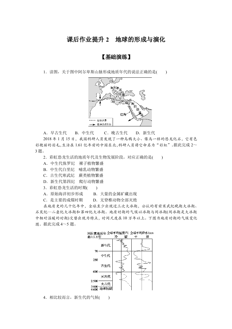 学生啦:课后作业提升2地球的形成与演化【基础演练】1.读图,关于图中阿尔卑斯山脉形成地质年代的说法正确的是()E-D红海A.早古生代B.中生代C.晚古生代D.新生代2018年1月15日,我国科研人员发现了一种乌鸦大小、像乌一样的恐龙化石,它有色彩艳丽的羽毛,生活在1.61亿年前的中国东北,科研人员将它命名为“彩虹”。据此完成2一3题。2.彩虹恐龙生活的地质年代及生物发展阶段,对应正确的是()A.中生代侏罗纪裸子植物繁盛B.中生代白垩纪哺乳动物繁盛C.古生代寒武纪蕨类植物繁盛D.新生代第四纪爬行动物繁盛3.彩虹恐龙生活的时期()A.原始海洋初步形成B.大量的金属矿藏出现C.是主要的成煤时期D.无脊椎动物全部灭绝在地质史的几十亿年中,全球至少出现过三次大冰期,公认的有前寒武纪晚期大冰期、石炭纪一二叠纪大冰期和第四纪大冰期。地质时期的气候以冰期与间冰期(间冰期是大冰期中相对温暖的时期)交替出现为特,点,时间尺度在10万年以上。下图为地质时期的气候变化图。据此完成4一5题。十250600-2500-4.相比较而言,新生代的气候()