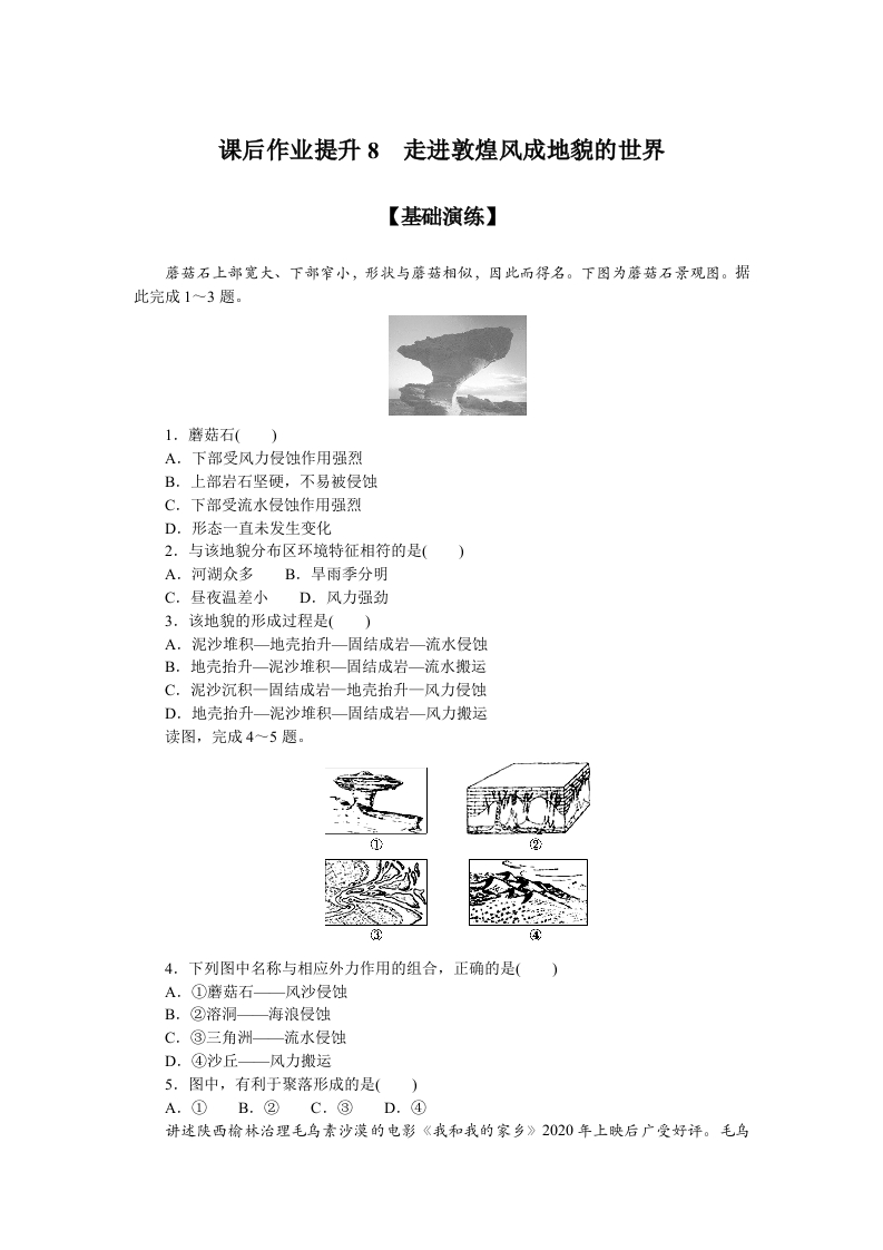 学生啦:课后作业提升8走进敦煌风成地貌的世界【基础演练】蘑菇石上部宽大、下部窄小,形状与蘑菇相似,因此而得名。下图为蘑菇石景观图。据此完成1~3题。1.蘑菇石(A.下部受风力侵蚀作用强烈B.上部岩石坚硬,不易被侵蚀C.下部受流水侵蚀作用强烈D.形态一直未发生变化2.与该地貌分布区环境特征相符的是()A.河湖众多B.旱雨季分明C.昼夜温差小D.风力强劲3.该地貌的形成过程是()A.泥沙堆积一地壳抬升一固结成岩一流水侵蚀B.地壳抬升一泥沙堆积一固结成岩一流水搬运C.泥沙沉积一固结成岩一地壳抬升一风力侵蚀D.地壳抬升一泥沙堆积一固结成岩一风力搬运读图,完成4~5题。4.下列图中名称与相应外力作用的组合,正确的是()A.①蘑菇石一—风沙侵蚀B.②溶洞—海浪侵蚀C.③三角洲一流水侵蚀D.④沙丘—风力搬运5.图中,有利于聚落形成的是()A.①B.②C.③D.④讲述陕西榆林治理毛乌素沙漠的电影《我和我的家乡》2020年上映后广受好评。毛乌