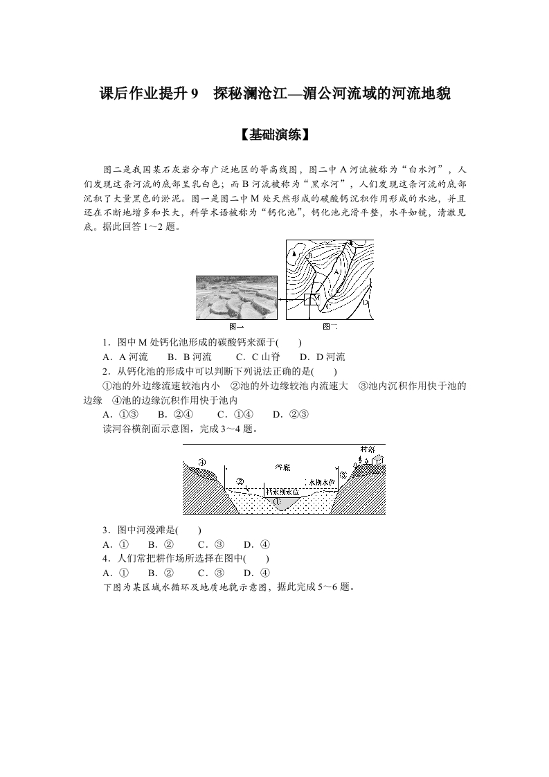 学生啦:课后作业提升9探秘澜沧江一湄公河流域的河流地貌【基础演练】图二是我国某石灰岩分布广泛地区的等高线图,图二中A河流被称为“白水河”,人们发现这条河流的底部呈乳白色;而B河流被称为“黑水河”,人们发现这条河流的底部沉积了大量黑色的淤泥。图一是图二中M处天然形成的碳酸钙沉积作用形成的水池,并且还在不断地增多和长大,科学术语被称为“钙化池”,钙化池光滑平整,水平如镜,清澈见底。据此回答1~2题。图一图1.图中M处钙化池形成的碳酸钙来源于(A.A河流B.B河流C.C山脊D.D河流2.从钙化池的形成中可以判断下列说法正确的是(①池的外边缘流速较池内小②池的外边缘较池内流速大③池内沉积作用快于池的边缘④池的边缘沉积作用快于池内A.①③B.②④C.①④D.②③读河谷横剖面示意图,完成3一4题。村济3.图中河漫滩是()A.①B.②C.③D.④4.人们常把耕作场所选择在图中()A.①B.②C.③D.④下图为某区战水循环及地质地貌示意图,据此完成5一6题。