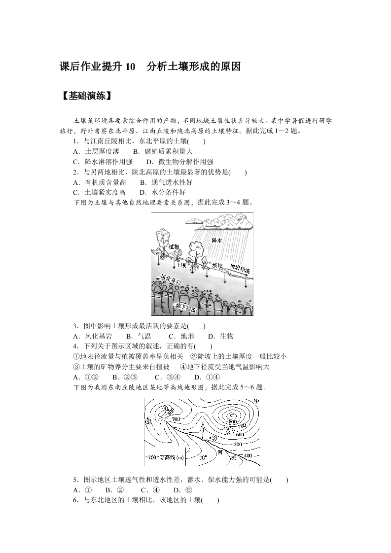 学生啦:课后作业提升10分析土壤形成的原因【基础演练】土壤是环境各要素综合作用的产物,不同地域土壤性状差异较大。某中学署假进行研学旅行,野外考察东北平原、江南丘陵和陕北高原的土壤特征。据此完成1一2题。1.与江南丘陵相比,东北平原的土壤()A.土层厚度薄B.腐殖质累积量大C.降水淋溶作用强D.微生物分解作用强2.与另两地相比,陕北高原的土壤最显著的优势是()A.有机质含量高B.通气透水性好C.土壤紧实度高D.水分条件好下图为土壤与其他自然地理要素关系图,据此完成3~4题。3.图中影响土壤形成最活跃的要素是(A.风化基岩B.气温C.地形D.生物4.下列关于图示区域的叙述,正确的有()①地表径流量与植被覆盖率呈负相关②陡坡上的土壤厚度一般比较小③土壤的矿物养分主要来自植被④地下径流受当地气温影响大A.①②B.②③C.③④D.①④下图为我国东南丘陵地区某地等高线地形图,据此完成5一6题。5.图示地区土壤透气性和透水性差,蓄水、保水能力强的可能是()A.①B.②C.④D.⑤6.与东北地区的土壤相比,该地区的土壤()
