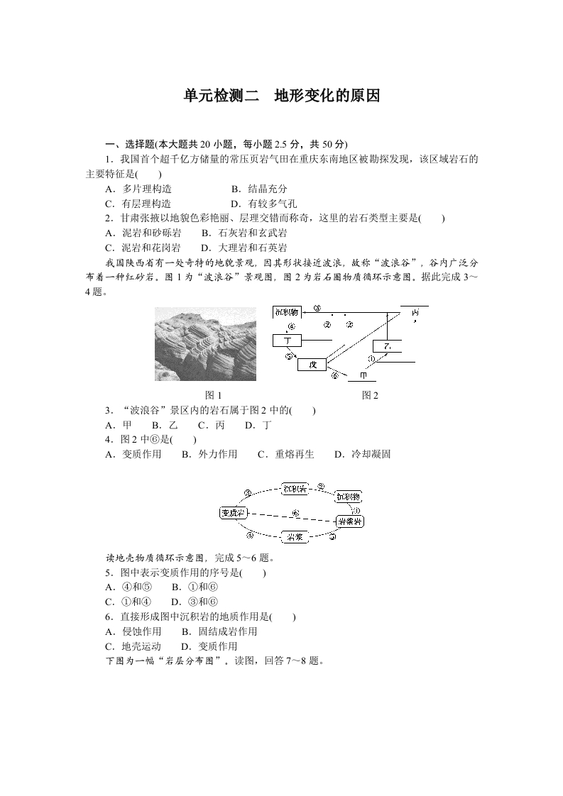 学生啦:单元检测二地形变化的原因一、选择题(本大题共20小题,每小题2.5分,共50分)1,我国首个超千亿方储量的常压页岩气田在重庆东南地区被勘探发现,该区域岩石的主要特征是()A.多片理构造B.结晶充分C.有层理构造D.有较多气孔2.甘肃张掖以地貌色彩艳丽、层理交错而称奇,这里的岩石类型主要是()A.泥岩和砂砾岩B.石灰岩和玄武岩C.泥岩和花岗岩D.大理岩和石英岩我国陕西省有一处奇特的地貌景观,因其形状接近波浪,故称“波浪谷”,谷内广泛分布着一种红砂岩。图1为“波浪谷”景观图,图2为岩石圈物质循环示意图。据此完成3一4题。图1图23.“波浪谷”景区内的岩石属于图2中的()A.甲B.乙C.丙4.图2中⑥是()A.变质作用B.外力作用C.重熔再生D.冷却凝固读地壳物质循环示意图,完成56题。5.图中表示变质作用的序号是()A.④和⑤B.①和⑥C.①和④D.③和⑥6.直接形成图中沉积岩的地质作用是()A.侵蚀作用B.固结成岩作用C.地壳运动D.变质作用下图为一幅“岩层分布图”。读图,回答7一8题。
