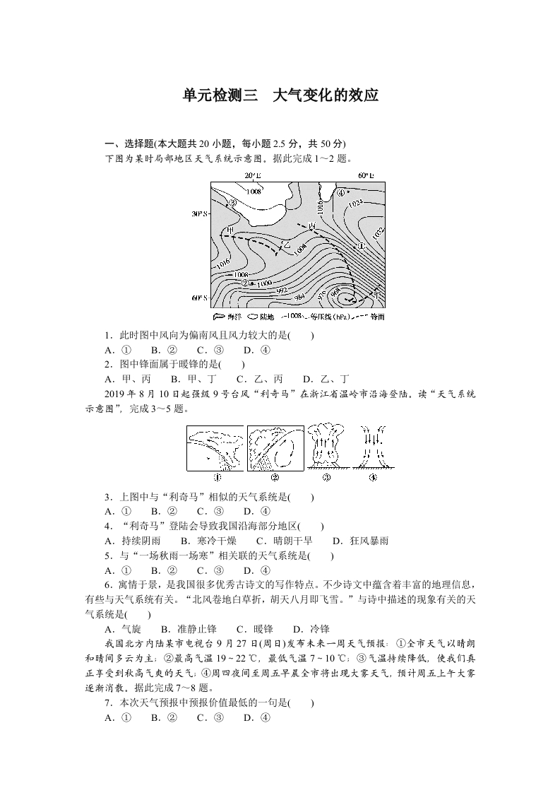 学生啦:单元检测三大气变化的效应一、选择题(本大题共20小题,每小题2.5分,共50分)下图为某时局部地区天气系统示意图。据此完成1一2题。20上1.此时图中风向为偏南风且风力较大的是(A.①B.②C.③D.④2.图中锋面属于暖锋的是()A.甲、丙B.甲、丁C.乙、丙D.乙、丁2019年8月10日起强级9号台风“利奇马”在浙江省温岭市沿海登陆。渎“天气系统示意图”,完成3~5题。tt't4.3.上图中与“利奇马”相似的天气系统是(A.①B.②C.③D.④4.“利奇马”登陆会导致我国沿海部分地区()A.持续阴雨B.寒冷干燥C.晴朗干旱D.狂风暴雨5.与“一场秋雨一场寒”相关联的天气系统是(A.①B.②C.③D.④6.寓情于景,是我国很多优秀古诗文的写作特点。不少诗文中蕴含着丰富的地理信息,有些与天气系统有关。“北风卷地白草折,胡天八月即飞雪。”与诗中描述的现象有关的天气系统是()A.气旋B.准静止锋C.暖锋D.冷锋我国北方内陆某市电视台9月27日(周日)发布未来一周天气预报:①全市天气以晴朗和晴间多云为主;②最高气温19~22℃,最低气温7~10℃;③气温持续降低,使我们真正享受到秋高气爽的天气:④周四夜间至周五早展全市将出现大雾天气,预计周五上午大雾逐渐消敬。据此完成78题。7.本次天气预报中预报价值最低的一句是()A.①B.②C.③D.④