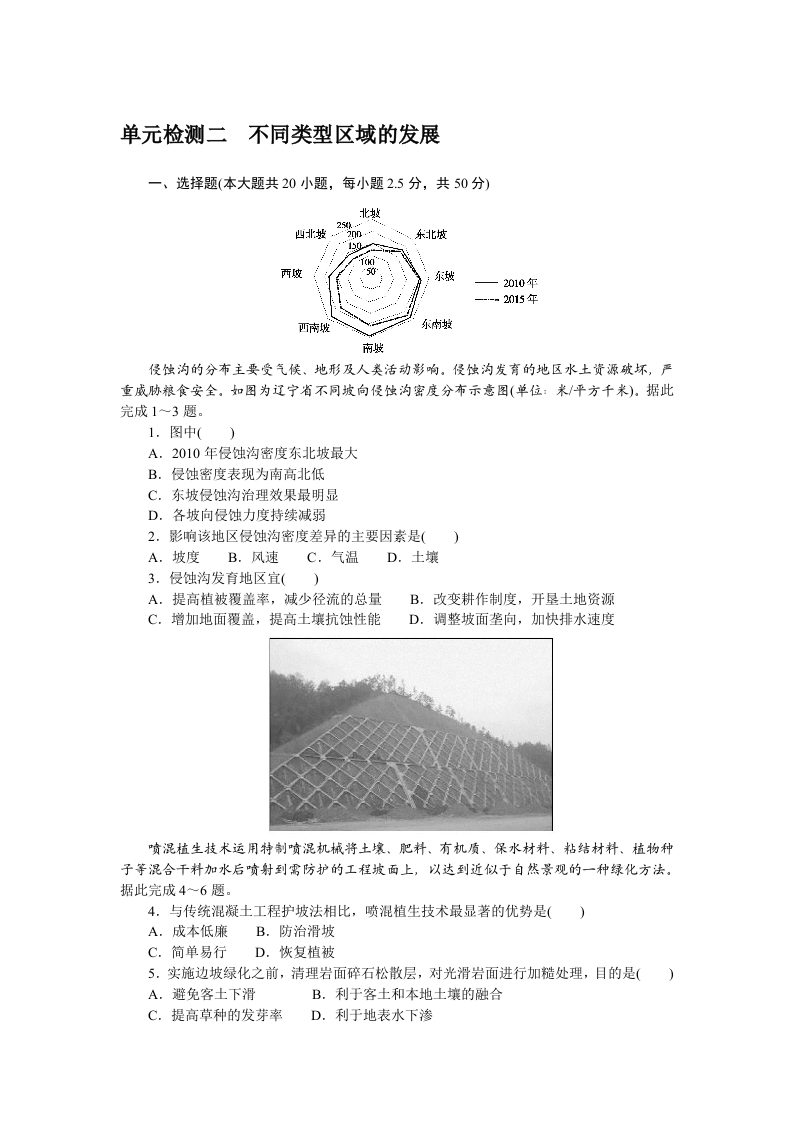 学生啦:单元检测二不同类型区域的发展一、选择题(本大题共20小题,每小题2.5分,共50分)—2010年--2015年侵蚀沟的分布主要受气候、地形及人类活动影响。侵蚀沟发育的地区水土资源破坏,严重威胁粮食安全。如图为辽宁省不同坡向侵蚀沟密度分布示意图(单位:米/平方千米)。据此完成1一3题。1.图中()A.2010年侵蚀沟密度东北坡最大B.侵蚀密度表现为南高北低C.东坡侵蚀沟治理效果最明显D.各坡向侵蚀力度持续减弱2.影响该地区侵蚀沟密度差异的主要因素是()A.坡度B.风速C.气温D.土壤3.侵蚀沟发育地区宜(A.提高植被覆盖率,减少径流的总量B.改变耕作制度,开垦土地资源C.增加地面覆盖,提高土壤抗蚀性能D.调整坡面垄向,加快排水速度喷混植生技术运用特制喷混机械将土壤、肥料、有机质、保水材料、粘结材料、植物种子等混合干料加水后喷射到需防护的工程坡面上,以达到近似于自然景观的一种绿化方法。据此完成4一6题。4.与传统混凝土工程护坡法相比,喷混植生技术最显著的优势是()A.成本低廉B.防治滑坡C.简单易行D.恢复植被5.实施边坡绿化之前,清理岩面碎石松散层,对光滑岩面进行加糙处理,目的是()A.避免客土下滑B.利于客土和本地土壤的融合C.提高草种的发芽率D.利于地表水下渗