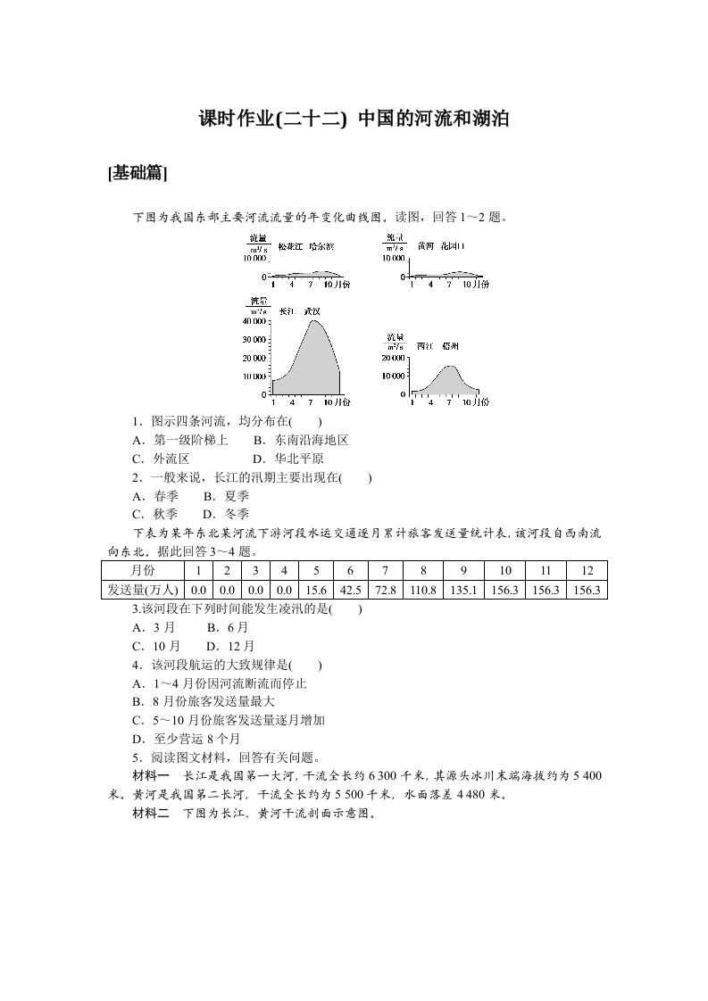学生啦:课时作业(二十二)中国的河流和湖泊基础篇]下图为我国东部主要河流流量的年变化曲线图。读图,回答1一2题。流松花江哈尔滨30000320001.图示四条河流,均分布在()A.第一级阶梯上B.东南沿海地区C.外流区D.华北平原2.一般来说,长江的汛期主要出现在(A.春季B.夏季C.秋季D.冬季下表为某年东北某河流下游河段水运交通逐月累计旅客发送量统计表,该河段自西南流向东北。据此回答3~4题。月份123456789101112发送量(万人)0.00.00.00.015.642.572.8110.8135.1156.3156.3156.33该河段在下列时间能发生凌汛的是(A.3月B.6月C.10月D.12月4.该河段航运的大致规律是(A.1一4月份因河流新流而停止B.8月份旅客发送量最大C.5~10月份旅客发送量逐月增加D.至少营运8个月5.阅读图文材料,回答有关问题。材料一长江是我国第一大河,千流全长约6300千米,其源头冰川末端海拔约为5400米。黄河是我国第二长河,千流全长约为5500千米,水面落差4480米。材料二下图为长江、黄河千流剖面示意图。