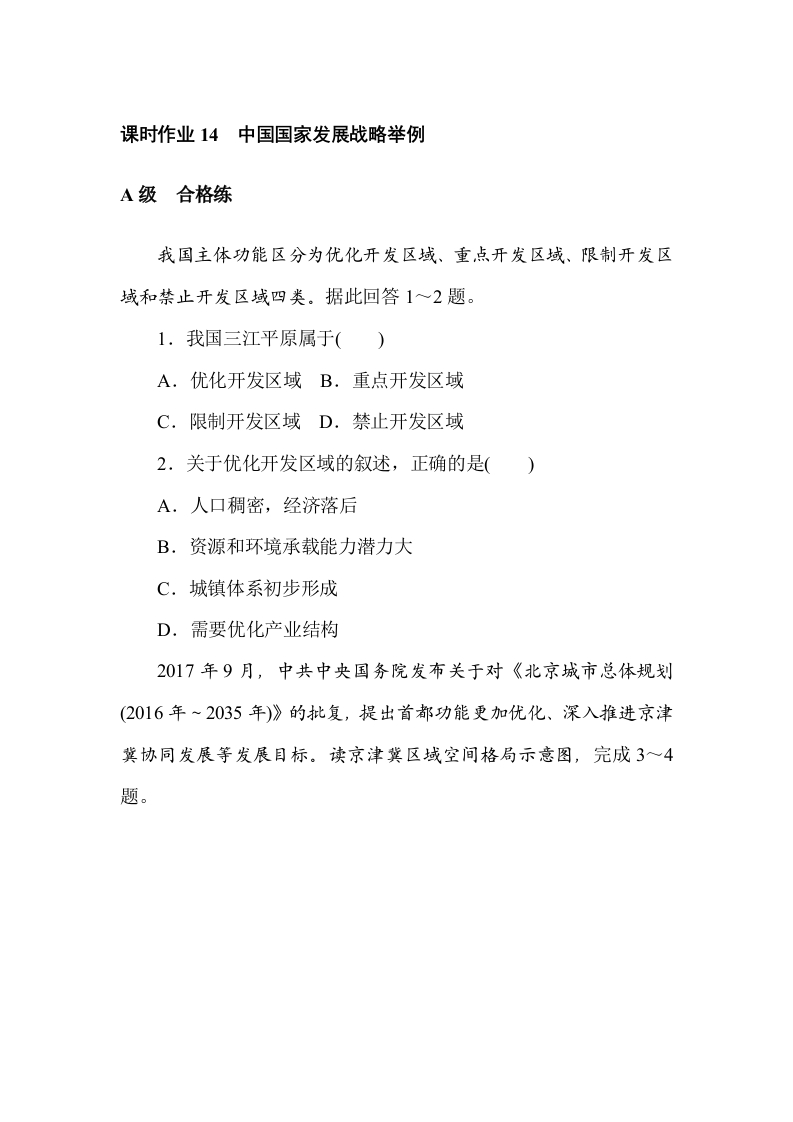 学生啦:课时作业14中国国家发展战略举例A级合格练我国主体功能区分为优化开发区域、重,点开发区域、限制开发区域和禁止开发区域四类。据此回答1~2题。1.我国三江平原属于()A.优化开发区域B.重点开发区域C.限制开发区域D.禁止开发区域2.关于优化开发区域的叙述,正确的是()A.人口稠密,经济落后B.资源和环境承载能力潜力大C.城镇体系初步形成D.需要优化产业结构2017年9月,中共中央国务院发布关于对《北京城市总体规划(2016年~2035年)》的批复,提出首都功能更加优化、深入推进京津冀协同发展等发展目标。读京津冀区域空间格局示意图,完成3~4题。