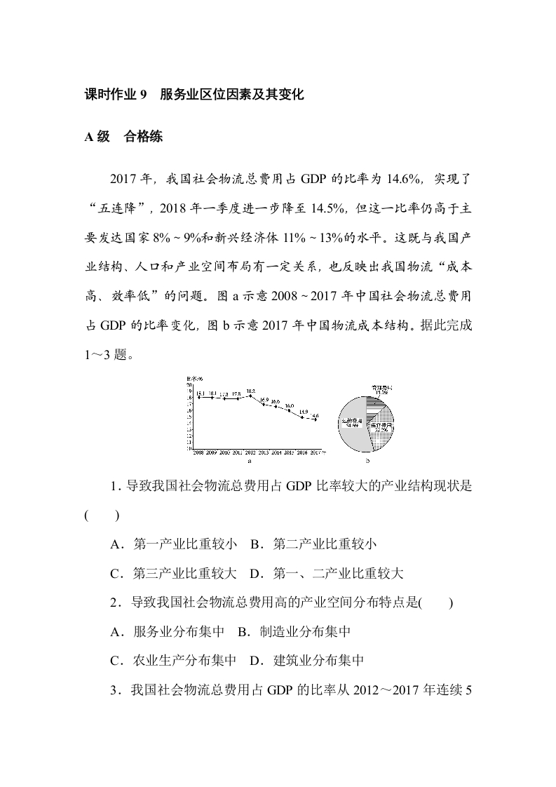 学生啦:课时作业9服务业区位因素及其变化A级合格练2017年,我国社会物流总费用占GDP的比率为14.6%,实现了“五连降”,2018年一季度进一步降至14.5%,但这一比率仍高于主要发达国家8%~9%和新兴经济体11%~13%的水平。这既与我国产业结构、人口和产业空间布局有一定关系,也反映出我国物流“成本高、效率低”的问题。图a示意2008~2017年中国社会物流总费用占GDP的比率变化,图b示意2017年中国物流成本结构。据此完成61.导致我国社会物流总费用占GDP比率较大的产业结构现状是()A.第一产业比重较小B.第二产业比重较小C.第三产业比重较大D.第一、二产业比重较大2.导致我国社会物流总费用高的产业空间分布特点是()A.服务业分布集中B.制造业分布集中C.农业生产分布集中D.建筑业分布集中3.我国社会物流总费用占GDP的比率从2012~2017年连续5