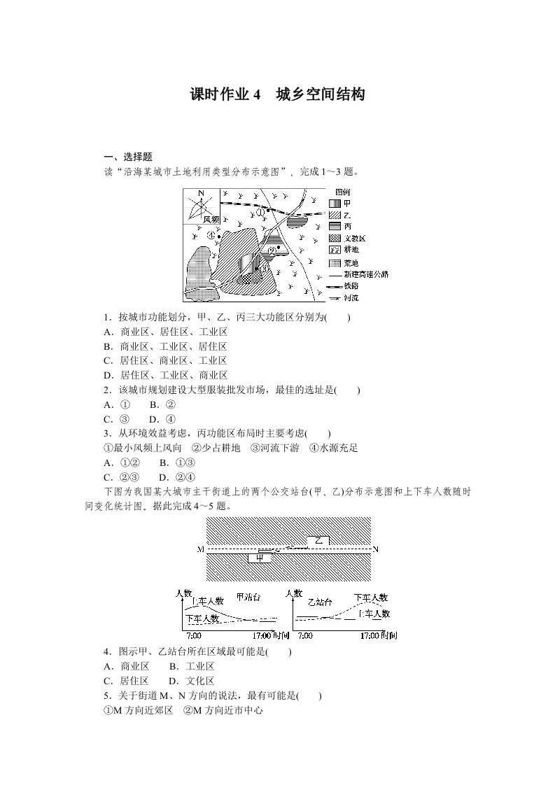 学生啦:课时作业4城乡空间结构、选择题读“沿海某城市土地利用类型分布示意图”,完成1一3题。图例1.按城市功能划分,甲、乙、丙三大功能区分别为()A.商业区、居住区、工业区B.商业区、工业区、居住区C.居住区、商业区、工业区D.居住区、工业区、商业区2.该城市规划建设大型服装批发市场,最佳的选址是()A.①B.②C.③D.④3.从环境效益考虑,丙功能区布局时主要考虑(①最小风频上风向②少占耕地③河流下游④水源充足A.①②B.①③C.②③下图为我国某大城市主干街道上的两个公交站台(甲、乙)分布示意图和上下车人数随时间变化统计图。据此完成4~5题。人下车人数7:004.图示甲、乙站台所在区域最可能是(A.商业区B.工业区C.居住区D.文化区5.关于街道M、N方向的说法,最有可能是(①M方向近郊区②M方向近市中心
