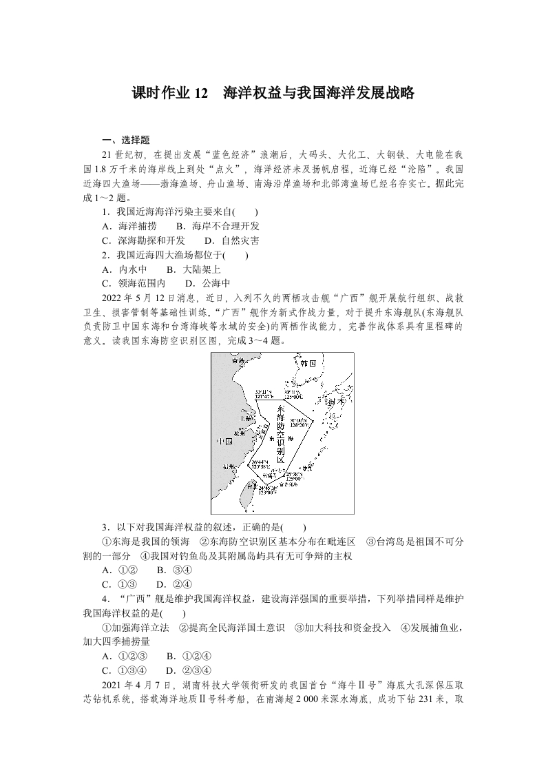 学生啦:课时作业12海洋权益与我国海洋发展战略一、选择题21世纪初,在提出发展“蓝色经济”浪潮后,大码头、大化工、大钢铁、大电能在我国18万千米的海岸线上到处“点火”,海洋经济未及扬帆启程,近海已经“沦陷”。我国近海四大渔场一渤海渔场、舟山渔场、南海沿岸渔场和北部湾渔场已经名存实亡。据此完成1~2题。1.我国近海海洋污染主要来自()A.海洋捕捞B.海岸不合理开发C.深海勘探和开发D.自然灾害2.我国近海四大渔场都位于(A.内水中B.大陆架上C.领海范围内D.公海中2022年5月12日消息,近日,入列不久的两栖攻击舰“广西”舰开展航行组织、战救卫生、损害管制等基础性训练。“广西”舰作为新式作战力量,对于提升东海舰队(东海舰队负责防卫中国东海和台湾海峡等水城的安全)的两栖作战能力,完善作战体系具有里程碑的意义。读我国东海防空识别区图,完成3一4题。海别3.以下对我国海洋权益的叙述,正确的是(①东海是我国的领海②东海防空识别区基本分布在毗连区③台湾岛是祖国不可分割的一部分④我国对钓鱼岛及其附属岛屿具有无可争辩的主权A.①②B.③④C.①③D.②④4.“广西”舰是维护我国海洋权益,建设海洋强国的重要举措,下列举措同样是维护我国海洋权益的是(①加强海洋立法②提高全民海洋国土意识③加大科技和资金投入④发展捕鱼业,加大四季捕捞量A.①②③B.①②④2021年4月7日,湖南科技大学领衔研发的我国首台“海牛Ⅱ号”海底大孔深保压取芯钻机系统,搭载海洋地质Ⅱ号科考船,在南海超2000米深水海底,成功下钻231米,取