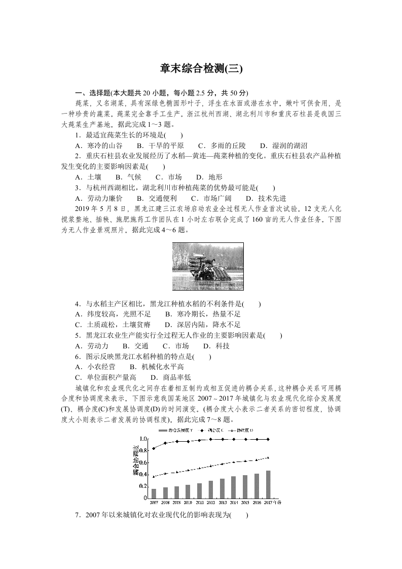 学生啦:章末综合检测(三)一、选择题(本大题共20小题,每小题2.5分,共50分)莼菜,又名湖菜,具有深绿色椭圆形叶子,浮生在水面或潜在水中。嫩叶可供食用,是一种珍贵的蔬菜。莼菜完全靠手工生产。浙江杭州西湖、湖北利川市和重庆石柱县是我国三大莼菜生产基地。据此完成1一3题。1.最适宜莼菜生长的坏境是()A.寒冷的山谷B.干旱的平原C.多雨的丘陵D.湿润的湖沼2.重庆石柱县农业发展经历了水稻一黄连一莼菜种植的变化。重庆石柱县农产品种植发生变化的主要影响因素是()A.土壤B.气候C.市场D.地形3.与杭州西湖相比,湖北利川市种植莼菜的优势最可能是(A.劳动力廉价B.交通便利C.市场广阔D.技术先进2019年5月8日,黑龙江建三江农场启动农业全过程无人作业首次试验。12支无人化搅浆整地、插秧、施肥施药工作团队在1小时左右联合完成了160亩的无人作业任务。下图为无人作业景观照片。据此完成4~6题。4.与水稻主产区相比,黑龙江种植水稻的不利条件是(A,纬度较高,光照不足B.寒冷期长,热量不足C.土质疏松,土壤贫瘠D.深居内陆,降水不足5.黑龙江农业生产能实行全过程无人作业的主要影响因素是()A.劳动力B.交通C.市场D.科技6.图示反映黑龙江水稻种植的特点是()A.小农经营B.机械化水平高C.单位面积产量高D.商品率低城镇化和农业现代化之间存在着相互制约或相互促进的耦合关系,这种耦合关系可用耦合度和协调度来表示。下图示意我国某地区2007~2017年城镇化与农业现代化综合发展度(T、耦合度(C)和发展协调度(①)的时间演变。(耦合度大小表示二者关系的密切程度,协调度大小则表示二者发展的协调程度)。据此完成7~8题。1.07.2007年以来城镇化对农业现代化的影响表现为(