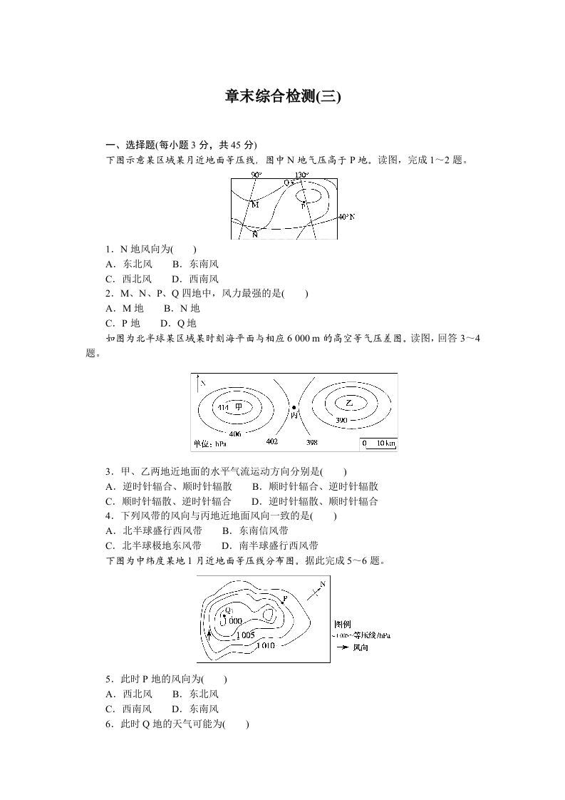 学生啦:章末综合检测(三)一、选择题(每小题3分,共45分)下图示意某区域某月近地面等压线,图中N地气压高于P地。读图,完成1一2题。1301.N地风向为()A.东北风B.东南风C.西北风D.西南风2.M、N、P、Q四地中,风力最强的是()A.M地B.N地C.P地D.Q地知图为北半球某区域某时刻海平面与相应6000m的高空等气压差图。读图,回答3一4题。内单位:hP40239010km3.甲、乙两地近地面的水平气流运动方向分别是()A.逆时针辐合、顺时针辐散B.顺时针辐合、逆时针辐散C.顺时针辐散、逆时针辐合D.逆时针辐散、顺时针辐合4.下列风带的风向与丙地近地面风向一致的是()A.北半球盛行西风带B.东南信风带C.北半球极地东风带D.南半球盛行西风带下图为中纬度某地1月近地面等压线分布图。据此完成5一6题。例10055.此时P地的风向为()A.西北风B.东北风C.西南风D.东南风6.此时Q地的天气可能为()