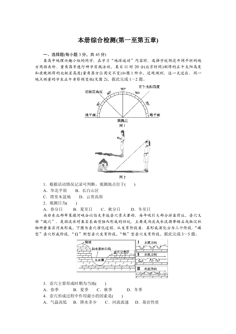 学生啦:本册综合检测(第一至第五章)一、选择题(每小题3分,共45分)某高中地理兴趣小组的同学,在学习“地球运动”内容时,选择学校附近开阔平坦的地方用指南针、量角器等进行研学实践活动。某日11时20分(北京时间)测得的正午太阳高度和夜晚测得的北极星高度(量角器方位固定不变)如图1所示。还观测到,这一天过后,同一地,点测量的学生正午身彩稍变短(见图2)。据此完成1~2题。90°北极星高度地平血地平血观测点1.根据活动情况记录可判断,观测地点位于(A.华北平原B.长白山区C.塔里木盆地D.云贵高原2.观测日为()A.春分日B.夏至日C.秋分日D.冬至日南非东北部布莱德河峡谷以伯克幸运壶穴景点著称,每年吸引大部分游客前往,壶穴又称“瓯穴”,是指流水对基岩表面侵蚀而形成的凹坑,主要是涡流或水流携带砾石或粗沉积物研磨基岩河床形成。下图为壶穴演化过程,从发育阶役看,其形成演化分为三个阶段:“碟型”壶穴形成阶段,“D”倒型壶穴发育阶段。“锅”型壶穴发育阶役。据此完成3一5题。I大水潭3.壶穴主要形成时期为当地()A.春季B.夏季C.秋季D.冬季4.壶穴形成过程中作用最小的因素是(A.气温高低B.降水多少C.河流流速D.基岩性质