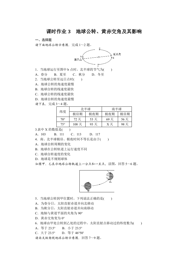 学生啦:课时作业3地球公转、黄赤交角及其影响读下面地球公转示意图,完成12题近山点d1.当地球运行至图中b点时,北半球的节气为(A.春分B.夏至C.秋分D.冬至2.当地球公转至远日点时(A.地球公转的角速度最慢B.地球自转的线速度最快C.地球公转的线速度最快D.地球自转的角速度最慢读下表,完成3一4题。北半球纬度南半球极昼期极夜期极夜期极昼期70°72天53天69天56天108天93天X天98天3.表中X的数值是(A.103B.111C.113D.1174.南、北半球极昼、极夜时间不等长是由于(A.地球自转周期的变化B.地球在公转轨道上运行速度不同C.地球自转速度的变化D.地球是不规则球体如图甲、乙表示地球公转轨道上一分点和一至点。读图,回答5~6题。5.当地球公转到甲位置时,下列说法正确的是(A.为春分日,太阳直射赤道并向北移动B.为秋分日,太阳直射赤道并向南移动C.地轴与黄道平面的夹角为90°D.黄赤交角变为0°6.地球由甲处公转到乙处的过程中,太阳直射点移动过的纬度数为()A.等于23.5°B.小于23.5C.大于23.5°D.等于4650读南天极俯视地球公转示意图,回答7~9题。