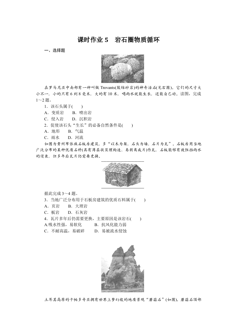 学生啦:课时作业5岩石圈物质循环一、选择题在罗马尼亚中南部有一种叫做Trovants(胶结砂岩)的神奇活石(见右图)。它们的尺寸大小不一,小的只有6到8毫米,大的有10米,喝雨水就能生长,还能自己动。读图,完成1.该石头属于()A.变质岩B.喷出岩C.侵入岩D.沉积岩2.促使该石头“生长”的必备自然条件是(A.地形B.气温C.雨水D.河流如图为贵州布依族石板房建筑,多“以木为架,石头为墙,石片为瓦”。石板房用当地广泛分布的某种优质石料(具有薄层状页理构造、易剥离成片)作瓦,石板能够有效阻挡雨水的侵袭,但多年后瓦片仍需要更换。据此完成3~4题。3.当地广泛分布用于石板房建筑的优质石料属于()A.页岩B.大理岩C.板岩D.石灰岩4.瓦片多年后仍需要更换,主要原因是该岩石()A吸水性强,易软化B.抗风化能力弱C.不耐高温,易破碎D.易被流水侵蚀土耳其高原的卡帕多奇亚拥有世界上梦幻般的地质景观“蘑菇石”(如图),蘑菇石顶部