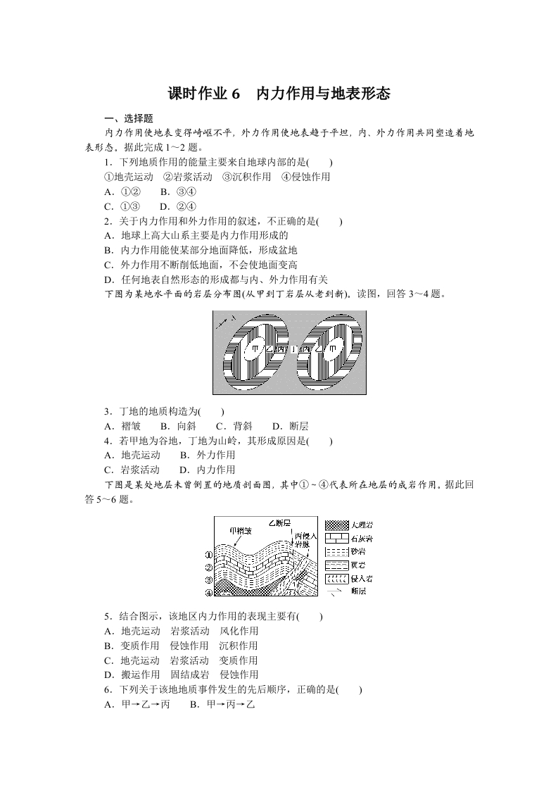 学生啦:课时作业6内力作用与地表形态内力作用使地表变得崎岖不平,外力作用使地表趋于平坦,内、外力作用共同塑造着地表形态。据此完成1~2题。1.下列地质作用的能量主要来自地球内部的是()①地壳运动②岩浆活动③沉积作用④侵蚀作用A.①②B.③④C.①③D.②④2.关于内力作用和外力作用的叙述,不正确的是()A.地球上高大山系主要是内力作用形成的B.内力作用能使某部分地面降低,形成盆地C.外力作用不断削低地面,不会使地面变高D.任何地表自然形态的形成都与内、外力作用有关下图为某地水平面的岩层分布图(从甲到丁岩层从老到新)。读图,回答3一4题。3.丁地的地质构造为()A.褶皱B.向斜C.背斜D.断层4.若甲地为谷地,丁地为山岭,其形成原因是(A.地壳运动B.外力作用C.岩浆活动D.内力作用下图是某处地层未曾倒置的地质剖面图,其中①~④代表所在地层的成岩作用。据此回答5~6题。、断层5,结合图示,该地区内力作用的表现主要有(A,地壳运动岩浆活动风化作用B.变质作用侵蚀作用沉积作用C.地壳运动岩浆活动变质作用D.搬运作用固结成岩侵蚀作用6.下列关于该地地质事件发生的先后顺序,正确的是()