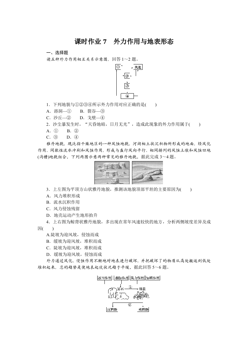 学生啦:课时作业7外力作用与地表形态读五种外力作用相互关系示意图,回答1一2题。1.下列地貌与①②③④所示外力作用对应正确的是(A.溶洞①B.裂谷③C.沙丘②D.戈壁④2.沙尘暴发生时,“天昏地暗,日月无光”,造成此现象的外力作用属于()A.①B.②C.③D.④雅丹地貌,现泛指干燥地区的一种风蚀地貌,河湖相土状沉积物所形成的地面,经风化作用、间歇性流水冲刷和风蚀作用,形成与盛行风向平行、相间排列的风蚀土墩和风蚀凹地(沟槽)地貌组合。下列两图示意两种常见的雅丹地貌。据此完成3一4题。3.上左图为平顶方山状雅丹地貌,推测该地貌顶部平坦的主要原因为()A.风力堆积形成B.流水沉积作用C.风力侵蚀残留D.地壳运动产生地形抬升4.上右图为鲸背状雅丹地貌,多出现在常年风速较快的地方,分析两侧坡度差异及成A陡坡为迎风坡,侵蚀而成B.缓坡为迎风坡,堆积而成C.陡坡为迎风坡,堆积而成D.缓坡为迎风坡,侵蚀而成外力通过风化、侵蚀作用不断地对地表进行破坏,并把破坏了的物质从高处搬运到低处推积起来,总的趋势是使地表起伏状况趋于平缓。据此回答5一6题。