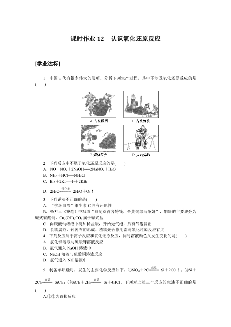 学生啦:课时作业12认识氧化还原反应[学业达标1.中国古代有很多伟大的发明。分析下列生产过程,其中不涉及氧化还原反应的是2.下列反应中不属于氧化还原反应的是(A.NO+NO2+2NaOH=2NaNO2+H20B.NH3+HCI-NH4CIC.Br2+2KI-I2+2KBr3.下列说法不正确的是()A.“抗坏血酸”维生素C具有还原性B.杨万里《戏笔》中写道“野菊荒苔各铸钱,金黄铜绿两争妍”,铜绿的主要成分为碱式碳酸铜,C2(OH2CO3属于碱式盐C.向碳酸钠溶液中滴加稀盐酸,开始无气泡,后有气泡冒出D.食物腐败、钟乳石的形成、植物光合作用都与氧化还原反应有关4.下列反应属于离子反应和氧化还原反应,同时溶液颜色又发生变化的是()A.氯化钡溶液与硫酸钾溶液反应B.氯气通入NaOH溶液中C.NaOH溶液与硫酸铜溶液反应D.氯气通入Nal溶液中5.制备单质硅时,发生的主要化学反应如下:①S02十2C商温Si+2C0↑:②S1十A.①③为置换反应