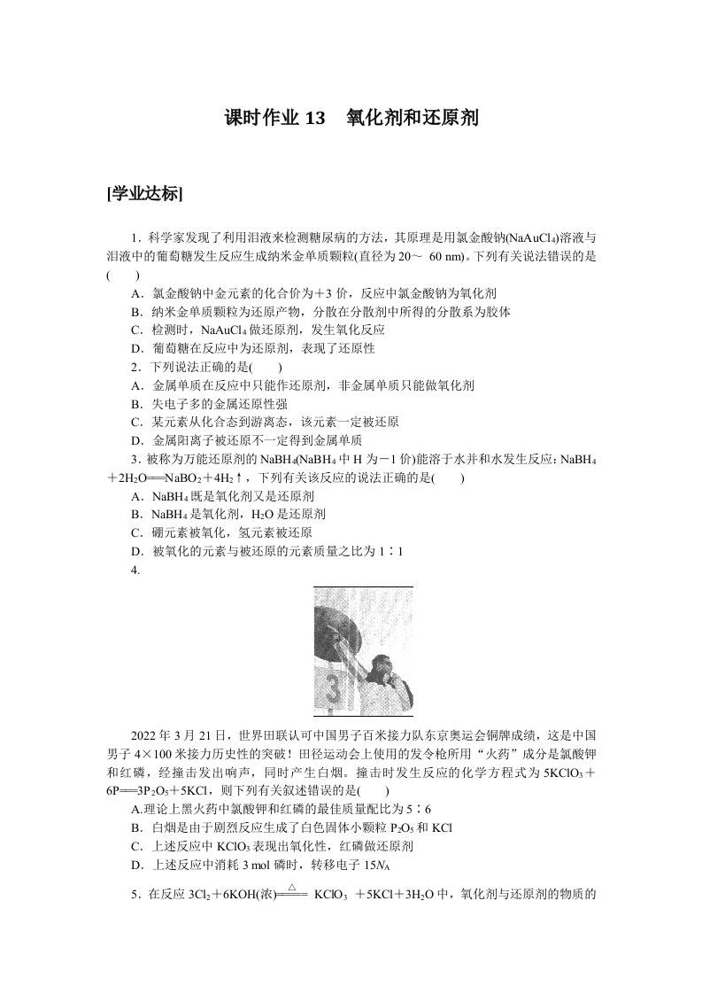 学生啦:课时作业13氧化剂和还原剂[学业达标1.科学家发现了利用泪液来检测糖尿病的方法,其原理是用氯金酸钠NaAuC1)溶液与泪液中的葡萄糖发生反应生成纳米金单质颗粒(直径为20~60m)。下列有关说法错误的是A.氯金酸钠中金元素的化合价为十3价,反应中氯金酸钠为氧化剂B.纳米金单质颗粒为还原产物,分散在分散剂中所得的分散系为胶体C.检测时,NaAuCl..做还原剂,发生氧化反应D.葡萄糖在反应中为还原剂,表现了还原性2.下列说法正确的是()A,金属单质在反应中只能作还原剂,非金属单质只能做氧化剂B.失电子多的金属还原性强C.某元素从化合态到游离态,该元素一定被还原D.金属阳离子被还原不一定得到金属单质3.被称为万能还原剂的NaBH4(NaBH4中H为一1价)能溶于水并和水发生反应:NaBH4+2 H2O-NaBO2十4H.↑,下列有关该反应的说法正确的是()A,NaBH既是氧化剂又是还原剂B.NaBHa是氧化剂,H2O是还原剂C.硼元素被氧化,氢元素被还原D.被氧化的元素与被还原的元素质量之比为1:12022年3月21日,世界田联认可中国男子百米接力队东京奥运会铜牌成绩,这是中国男子4×100米接力历史性的突破!田径运动会上使用的发令枪所用“火药”成分是氯酸钾和红磷,经撞击发出响声,同时产生白烟。撞击时发生反应的化学方程式为5KCO3+6P3P2O5+5KC1,则下列有关叙述错误的是()A.理论上黑火药中氯酸钾和红磷的最佳质量配比为5:6B.白烟是由于剧烈反应生成了白色固体小颗粒PO5和KCC.上述反应中KCO3表现出氧化性,红磷做还原剂D.上述反应中消耗3mol磷时,转移电子15Na