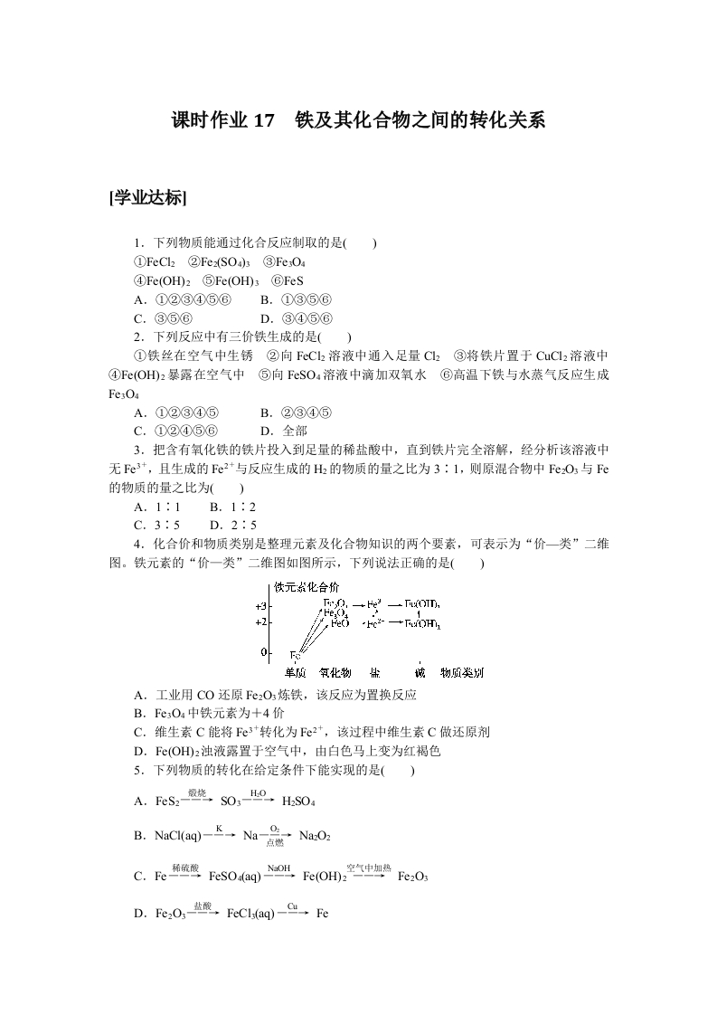 学生啦:课时作业17铁及其化合物之间的转化关系[学业达标1.下列物质能通过化合反应制取的是()A.①②③④⑤⑥B.①③⑤⑥D.③④⑤⑥2.下列反应中有三价铁生成的是(①铁丝在空气中生锈②向FC2溶液中通入足量C2③将铁片置于CuC12溶液中④Fe(OHDz暴露在空气中⑤向FeSO.溶液中滴加双氧水⑥高温下铁与水蒸气反应生成A.①②③④⑤B.②③④⑤C.①②④⑤⑥D.全部3.把含有氧化铁的铁片投入到足量的稀盐酸中,直到铁片完全溶解,经分析该溶液中无Fe3+,且生成的e2+与反应生成的H的物质的量之比为3:1,则原混合物中FeO3与Fe的物质的量之比为()A.1:1B.1:2C.3:5D.2:54.化合价和物质类别是整理元素及化合物知识的两个要素,可表示为“价一类”二维图。铁元素的“价一类”二维图如图所示,下列说法正确的是()+20下A.工业用CO还原F©2O炼铁,该反应为置换反应C.维生素C能将Fe3+转化为Fe2+,该过程中维生素C做还原剂D.FC(OHz浊液露置于空气中,由白色马上变为红褐色5.下列物质的转化在给定条件下能实现的是(