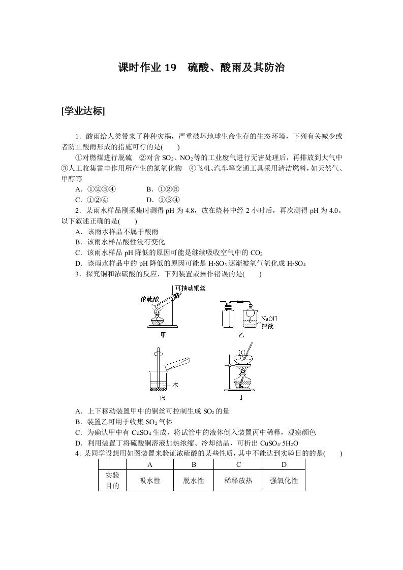 学生啦:课时作业19疏酸、酸雨及其防治[学业达标1.酸雨给人类带来了种种灾祸,严重破坏地球生命生存的生态环境,下列有关减少或者防止酸雨形成的措施可行的是()①对燃煤进行脱硫②对含SO2、NO,等的工业废气进行无害处理后,再排放到大气中③人工收集雷电作用所产生的氮氧化物④飞机、汽车等交通工具采用清洁燃料,如天然气、甲醇等A.①②③④B.①②③C.①②④D.①③④2.某雨水样品刚采集时测得pH为4.8,放在烧杯中经2小时后,再次测得pH为4.0。以下叙述正确的是()A.该雨水样品不属于酸雨B.该雨水样品酸性没有变化C.该雨水样品pH降低的原因可能是继续吸收空气中的CO2D.该雨水样品中的pH降低的原因可能是H2SO3逐渐被氧气氧化成HSO43.探究铜和浓硫酸的反应,下列装置或操作错误的是(浓硫酸丙A.上下移动装置甲中的铜丝可控制生成SO2的量B.装置乙可用于收集SO2气体C.为确认甲中有CSO4生成,将试管中的液体倒入装置丙中稀释,观察颜色D.利用装置丁将硫酸铜溶液加热浓缩、冷却结晶,可析出CuSO5H2O4.某同学设想用如图装置来验证浓硫酸的某些性质,其中不能达到实验目的的是(ABD实验目的吸水性脱水性稀释放热强氧化性