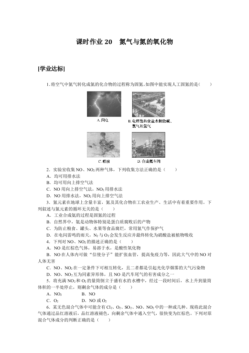学生啦:课时作业20氮气与氮的氧化物[学业达标1.将空气中氮气转化成氮的化合物的过程称为固氮.如图中能实现人工固氮的是()氯气和氢气2.实验室收集NO、NO2两种气体,下列收集方法正确的是()A.均可用排水法B.均可用向上排空气法C.NO用向上排空气法,NO2用排水法D.NO用排水法,NO2用向上排空气法3.氮元素在地球上含量丰富,氮及其化合物在工农业生产、生活中有着重要作用。下列叙述与氮元素的循环无关的是()A.工业合成氨的过程是固氮的过程B.自然界中,氨是动物体特别是蛋白质腐败后的产物C.为防止粮食、罐头、水果等食品腐烂,常用氮气作保护气D.在电闪雷鸣的雨天,N2与O2会发生反应并最终转化为硝酸盐被植物吸收4.下列对NO、NO2的描述正确的是()A.NO是红棕色气体,易溶于水,是酸性氧化物B.NO在人体内可做“信使分子”能扩张血管,提高免疫力等,因此大气中的NO对人体无害C.NO、NO2在一定条件下可相互转化,且二者都是引起光化学烟雾的大气污染物D.NO、NO2互为同素异形体,且NO是汽车尾气的有害成分之一5.将充满NO2和O2的量筒倒立于盛有水的水槽中,经过一段时间后,水上升到量筒体积的一半处停止,则剩余气体的成分是()A.NO2B.NOD.NO或O26.某无色混合气体中可能含有CI2、O2、SO2、NO、NO2中的一种或几种。现将此混合气体通过品红溶液后,品红溶液褪色,向剩余气体中通入空气,很快变为红棕色。下列对原混合气体成分的判断正确的是()