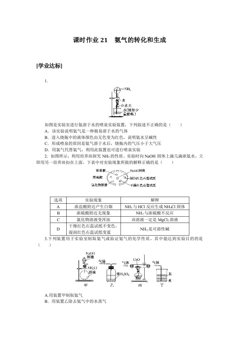 学生啦:课时作业21氨气的转化和生成[学业达标1.如图是实验室进行氨溶于水的喷泉实验装置,下列叙述不正确的是()A.该实验说明氨气是一种极易溶于水的气体B.进入烧瓶中的液体颜色由无色变为红色,说明氨水呈碱性C.形成喷泉的原因是氨气溶于水后,烧瓶内的气压小于大气压D.用氯气代替氨气,利用此装置也可进行喷泉实验2.如图所示,利用培养皿探究NH的性质。实验时向NaOH固体上滴几滴浓氨水,立即用另一培养皿扣在上面。下表中对实验现象所做的解释正确的是()选项实验现象解释A浓盐酸附近产生白烟NH与HCI反应生成NH:CI固体浓硫酸附近无现象NH3与浓硫酸不反应氯化物溶液变浑浊该溶液一定是MgC12溶液干燥红色石蕊试纸不变色,DNH3是可溶性碱湿润红色石蕊试纸变蓝3.下列装置用于实验室制取氨气或验证氨气的化学性质,其中能达到实验目的的是气体气休内入A.用装置甲制取氨气B.用装置乙除去氨气中的水蒸气