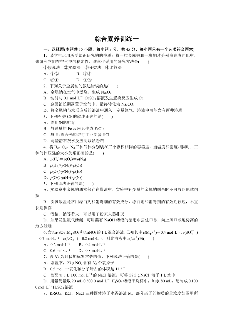学生啦:综合素养训练一一、选择题(本题共15小题,每小题3分,共45分,每小题只有一个选项符合题意)1.某学生运用所学知识研究钠的性质:将一粒金属钠和一块铜片分别盛在表面皿中,来研究它们在空气中的稳定性。该学生采用的研究方法是()①假说法②实验法③分类法④比较法A.①②B.①③C.②④2.下列关于金属钠的叙述错误的是(A.金属钠在空气中燃烧,生成NazO2B.钠能与0.1moL1CuSO4溶液发生置换反应生成CuC.金属钠长期露置于空气中,最终转化为Na2CO3D.将金属钠与水反应后的溶液中通入一定量氯气,溶液中可能含有两种溶质3.下列有关C12的叙述正确的是()A.能用钢瓶贮存B.与过量的Fe反应只生成FeCl2C.与H2混合光照进行工业制备HCID.与澄清石灰水反应制取漂粉精4.将H2、O2、N2三种气体分别装在三个容积相同的容器里,当温度和密度相同时,三种气体压强的大小关系正确的是()A.p(H2)=p(O2)=p(N2)C.p(O2p(N2)p(H2)5.下列说法正确的是()A.实验室中金属钠通常保存在煤油中,实验中有少量的金属钠剩余时不可放回原试剂瓶B.次氯酸盐是常用漂白剂和消毒剂的有效成分,漂白剂和消毒剂的有效期较短,不宜长期保存C.酒精、钠等着火,可以用干粉灭火器扑灭D.如果发生氯气泄漏,可用雠有NOH溶液的湿毛巾捂住口鼻,向上风▣或地势高的地方躲避6.含Na2S04、MgSO4和NaNO3的1L混合溶液,己知其中cMg2)=0.4molL1,c(S0)=0.7molL1,cNOs)=0.2molL1,则此溶液中cNa)为(C.0.6 molL D.0.8 mol-L-17.设N为阿伏加德罗常数的值,下列说法正确的是(A.常温下,23gNO2含有N个氧原子B.0.5mol一氧化碳分子所占的体积是11.2LC.欲配制1L1.00molL1的NaC1溶液,可将58.5gNaC1溶于1L水中D.用量筒量取20mL0.5000molL1H2S04溶液于烧杯中,加水80mL,配制成0.1008.KzSO4、KCI、NaC1三种固体溶于水得溶液M,部分离子的物质的量浓度如图甲所