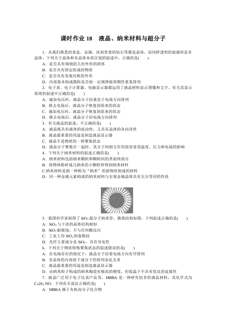 学生啦:课时作业18液晶、纳米材料与超分子1.从我们熟悉的食盐、金属、冰到贵重的钻石等都是晶体,而同样透明的玻璃却是非晶体。下列关于晶体和非晶体本质区别的叙述中,正确的是()A.是否具有规则的几何外形的固体B.是否具有固定组成的物质C.是否具有美观对称的外形D.内部基本构成微粒是否按一定规律做周期性重复排列2.电子表、电子计算器、电脑显示器都运用了液晶材料显示图像和文字。有关其显示原理的叙述中正确的是()A.施加电压时,液晶分子沿垂直于电场方向排列B.移去电场后,液晶分子恢复到原来的状态C.施加电压时,液晶分子恢复到原来的状态D.移去电场后,液晶分子沿电场方向排列3.有关液晶的叙述,不正确的是()A.液晶既具有液体的流动性,又具有晶体的各向异性B.液晶最重要的用途是制造液晶显示器C.液晶不是物质的一种聚集状态D.液晶分子聚集在一起时,其分子间相互作用很容易受温度、压力和电场的影响4.下列关于纳米材料的叙述正确的是()A.纳米材料包括纳米颗粒和颗粒间的界面两部分B.将物体粉碎成几纳米的小颗粒即得到纳米材料C纳米材料是指一种称为“纳米”的新物质制成的材料D.同一种金属元素构成的纳米材料与宏观金属晶体具有完全等同的性质5.我国科学家制得了SiO2超分子纳米管,微观结构如图。下列叙述正确的是()A.SiO2与干冰的晶体结构相似B.SiO2耐腐蚀,不与任何酸反应C.工业上用SO,制备粗硅D.光纤主要成分是SiO2,具有导电性6.下列关于物质特殊聚集状态的叙述错误的是()A.在电场存在的情况下,液晶分子沿着电场方向有序排列B.非晶体的内部原子或分子的排列杂乱无章C.液晶最重要的用途是制造液晶显示器D.由纳米粒子构成的纳米陶瓷有极高的硬度,但低温下不具有优良的延展性7.液晶广泛用于电子仪表产品等,MBBA是一种研究较多的液晶材料,其化学式为C1sH2NO,下列有关说法正确的是()A.MBBA属于有机高分子化合物