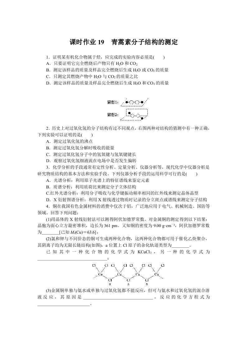 学生啦:课时作业19青蒿素分子结构的测定1.证明某有机化合物属于烃,应完成的实验内容必须是(A.只要证明它完全燃烧后产物只有H0和CO2B.测定该样品的质量及样品完全燃烧后生成HO或CO2的质量C.只测定其燃烧产物中HO与CO2的质量之比D.测定该样品的质量及样品完全燃烧后生成HO和CO2的质量2.历史上对过氧化氢的分子结构有过不同观点,右图两种对结构的猜测中有一种正确,下列实验可以证明的是()A.测定过氧化氢的沸点B.测定过氧化氢分解时吸收的能量C.测定过氧化氢分子中的氢氧键与氢氧键键长D.观察过氧化氢细液流在电场中是否发生偏转3.化学分析的手段通常有定性分析、定量分析、仪器分析等,现代化学中仪器分析是研究物质结构的基本方法和实验手段。下列仪器分析手段的运用科学可行的是()A.光谱分析:利用原子光谱上的特征谱线来鉴定元素B.质谱分析:利用质荷比来测定分子立体结构C.红外光谱分析:利用分子吸收与化学键振动频率相同的红外线来测定晶体晶型D.X衍射图谱分析:利用X射线透过物质时记录的分立斑点或谱线来测定分子结构4.铜在我国有色金属材料的消费中仅次于铝,广泛地应用于电气、机械制造、国防等领域。回答下列问题:(1)用晶体的X射线衍射法可以测得阿伏加德罗常数。对金属铜的测定得到以下结果:晶胞为面心立方最密堆积,边长为361pm。又知铜的密度为9.00gcm3,阿伏加德罗常数(2)氯和钾与不同价态的铜可生成两种化合物,这两种化合物都可用于催化乙炔聚合,其阴离子均为无限长链结构(如图),a位置上C1原子的杂化轨道类型为己知其中一种化合物的化学式为KCC13,另一种的化学式为CCu(u('u(3)金属铜单独与氨水或单独与过氧化氢都不能反应,但可与氨水和过氧化氢的混合溶液反应,其原因是反应的化学方程式为