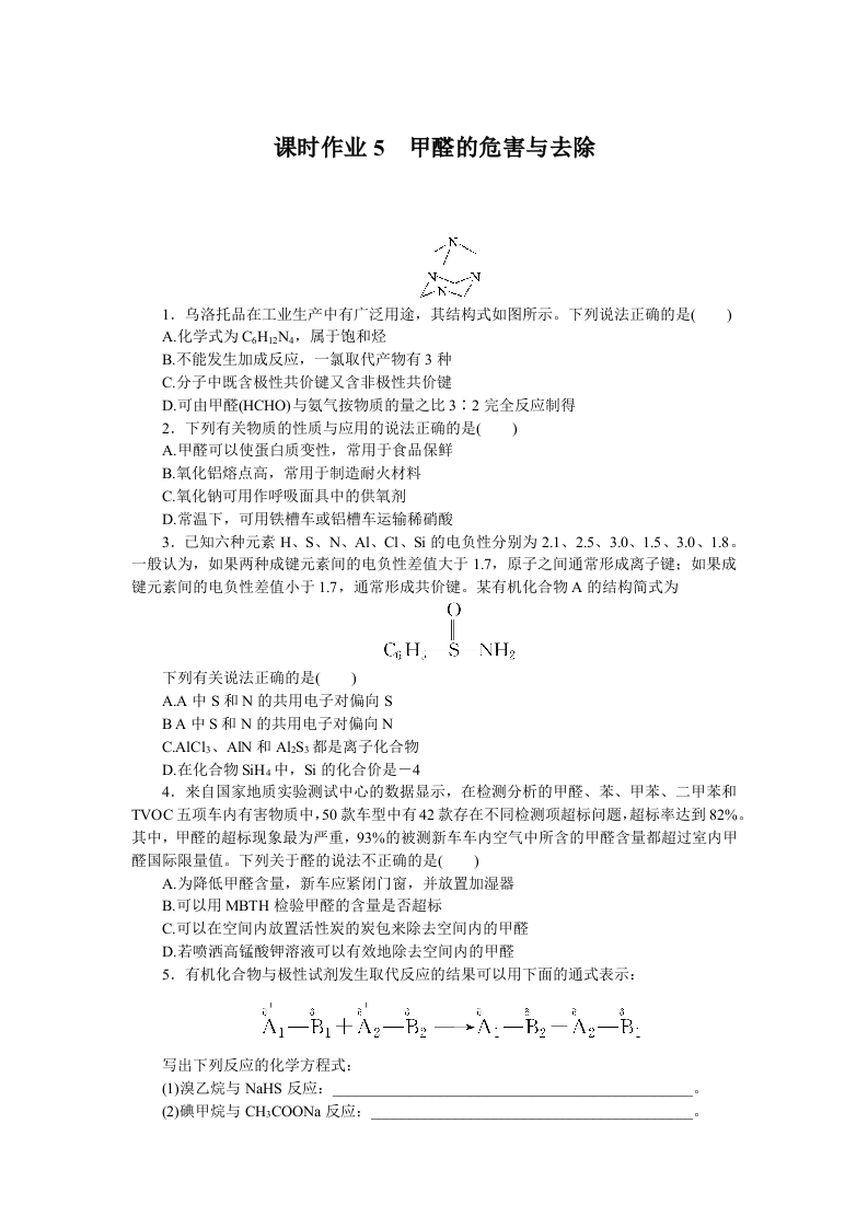 学生啦:课时作业5甲醛的危害与去除1.乌洛托品在工业生产中有广泛用途,其结构式如图所示。下列说法正确的是()A.化学式为CH2N4,属于饱和烃B.不能发生加成反应,一氯取代产物有3种C.分子中既含极性共价键又含非极性共价键D.可由甲醛HCHO)与氨气按物质的量之比3:2完全反应制得2.下列有关物质的性质与应用的说法正确的是(A.甲醛可以使蛋白质变性,常用于食品保鲜B.氧化铝熔点高,常用于制造耐火材料C.氧化钠可用作呼吸面具中的供氧剂D.常温下,可用铁槽车或铝槽车运输稀硝酸3.己知六种元素H、S、N、Al、C1、Si的电负性分别为2.1、2.5、3.0、1.5、3.0、1.8。一般认为,如果两种成键元素间的电负性差值大于1.7,原子之间通常形成离子键:如果成键元素间的电负性差值小于1.7,通常形成共价键。某有机化合物A的结构简式为)C:H:NH2下列有关说法正确的是()A.A中S和N的共用电子对偏向SBA中S和N的共用电子对偏向NC.AIC3、AN和AS3都是离子化合物D.在化合物SiH4中,Si的化合价是一44.来自国家地质实验测试中心的数据显示,在检测分析的甲醛、苯、甲苯、二甲苯和TV0C五项车内有害物质中,50款车型中有42款存在不同检测顶超标问题,超标率达到82%其中,甲醛的超标现象最为严重,93%的被测新车车内空气中所含的甲醛含量都超过室内甲醛国际限量值。下列关于醛的说法不正确的是()A.为降低甲醛含量,新车应紧闭门窗,并放置加湿器B.可以用MBTH检验甲醛的含量是否超标C.可以在空间内放置活性炭的炭包来除去空间内的甲醛D.若喷洒高锰酸钾溶液可以有效地除去空间内的甲醛5.有机化合物与极性试剂发生取代反应的结果可以用下面的通式表示:写出下列反应的化学方程式:(1)溴乙烷与NaHS反应: