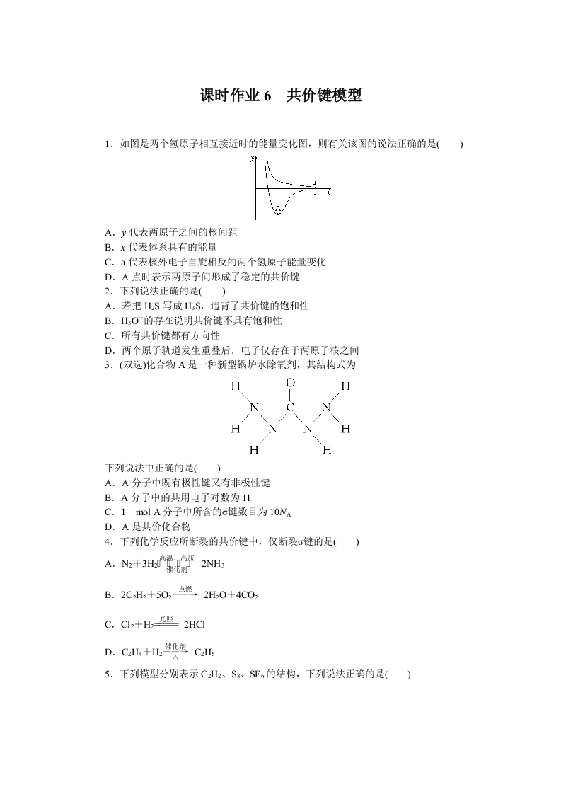 学生啦:课时作业6共价键模型1.如图是两个氢原子相互接近时的能量变化图,则有关该图的说法正确的是()A.y代表两原子之间的核间距B.x代表体系具有的能量C.a代表核外电子自旋相反的两个氢原子能量变化D.A点时表示两原子间形成了稳定的共价键2.下列说法正确的是()A.若把HS写成HS,违背了共价键的饱和性B.HO的存在说明共价键不具有饱和性C.所有共价键都有方向性D.两个原子轨道发生重叠后,电子仅存在于两原子核之间3.(双选)化合物A是一种新型锅炉水除氧剂,其结构式为HHHHHH下列说法中正确的是()A.A分子中既有极性键又有非极性键B.A分子中的共用电子对数为11C.1molA分子中所含的o键数目为10NAD.A是共价化合物4.下列化学反应所断裂的共价键中,仅断裂σ键的是()2NH3B.2C,H+502点,2H,0+4C025.下列模型分别表示C2H2、Sg、SF6的结构,下列说法正确的是()