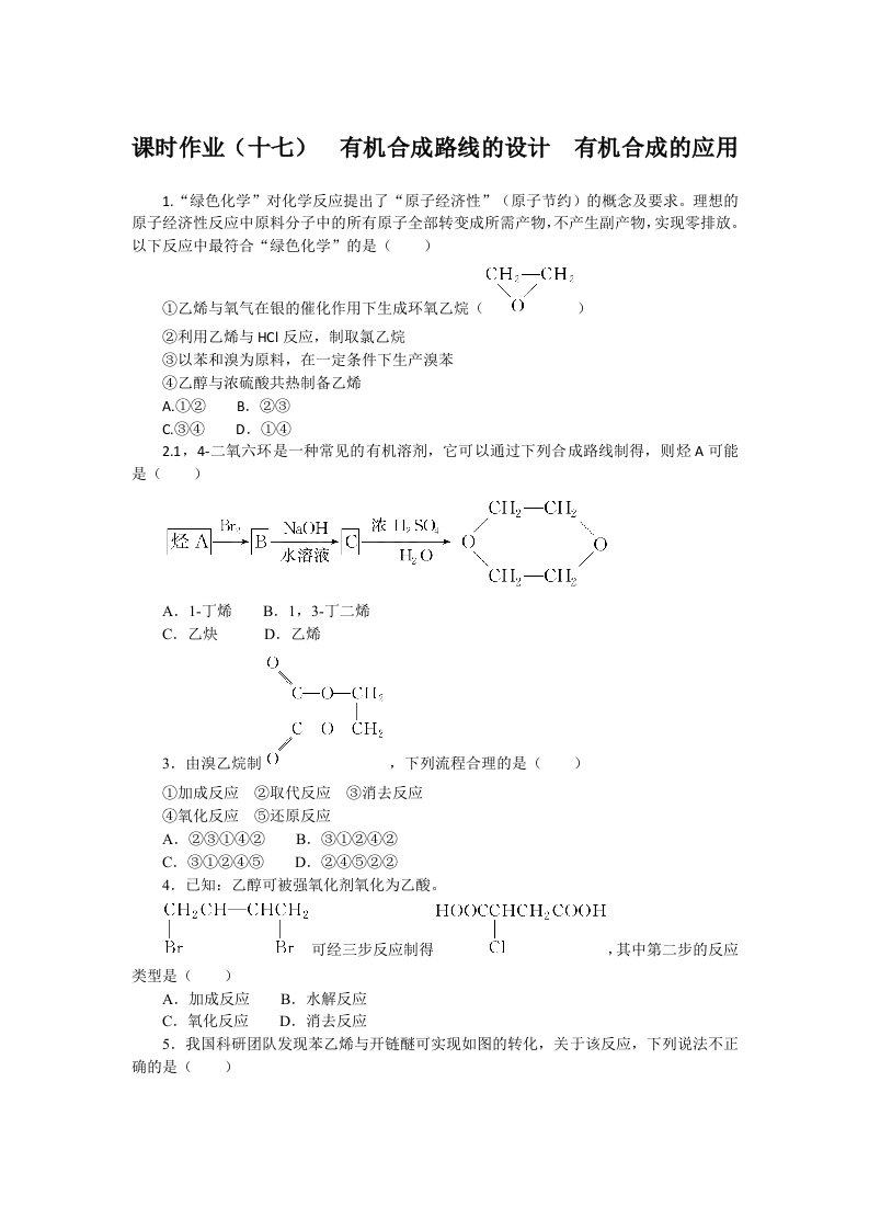 学生啦:课时作业(十七)有机合成路线的设计有机合成的应用1.“绿色化学”对化学反应提出了“原子经济性”(原子节约)的概念及要求。理想的原子经济性反应中原料分子中的所有原子全部转变成所需产物,不产生副产物,实现零排放。以下反应中最符合“绿色化学”的是()①乙烯与氧气在银的催化作用下生成环氧乙烷(()②利用乙烯与HCI反应,制取氯乙烷③以苯和溴为原料,在一定条件下生产溴苯④乙醇与浓硫酸共热制备乙烯B.②③c.③④D.①④21,4-二氧六环是一种常见的有机溶剂,它可以通过下列合成路线制得,则烃A可能Na()H水溶液A.1-丁烯B.1,3-丁二烯C.乙炔D.乙烯C (CH3.由溴乙烷制(),下列流程合理的是()①加成反应②取代反应③消去反应④氧化反应⑤还原反应A.②③①④②B.③①②④②D.②④⑤②②4.己知:乙醇可被强氧化剂氧化为乙酸。CH2CH-CHCH2BrBr可经三步反应制得,其中第二步的反应类型是()A.加成反应B.水解反应C.氧化反应D.消去反应5.我国科研团队发现苯乙烯与开链醚可实现如图的转化,关于该反应,下列说法不正