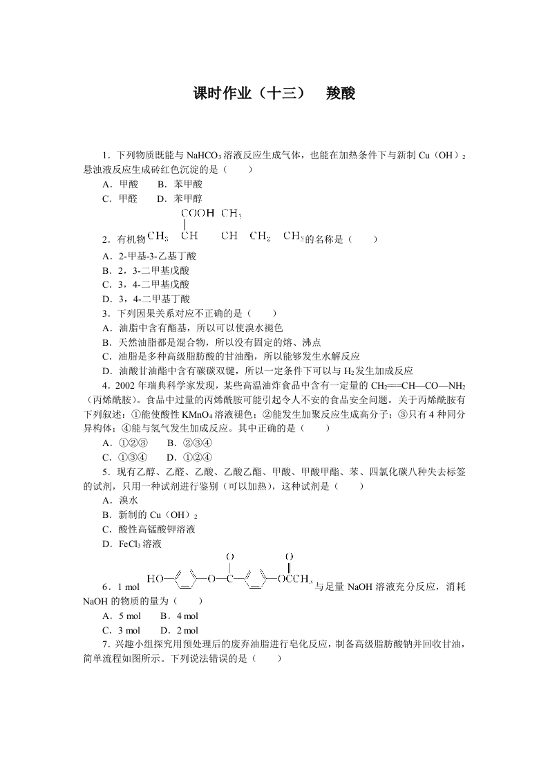 学生啦:课时作业(十三)羧酸1.下列物质既能与NaHCO3溶液反应生成气体,也能在加热条件下与新制Cu(OH)2悬浊液反应生成砖红色沉淀的是()A.甲酸B.苯甲酸C.甲醛D.苯甲醇COOH CHCHCH CHA.2甲基-3-乙基丁酸B.2,3-二甲基戊酸C.3,4二甲基戊酸D.3,4二甲基丁酸3.下列因果关系对应不正确的是()A.油脂中含有酯基,所以可以使溴水褪色B.天然油脂都是混合物,所以没有固定的熔、沸点C.油脂是多种高级脂肪酸的甘油酯,所以能够发生水解反应D.油酸甘油酯中含有碳碳双键,所以一定条件下可以与,发生加成反应4.2002年瑞典科学家发现,某些高温油炸食品中含有一定量的CH—CHCO一NH2(丙烯酰胺)。食品中过量的丙烯酰胺可能引起令人不安的食品安全问题。关于丙烯酰胺有下列叙述:①能使酸性KMO:溶液褪色:②能发生加聚反应生成高分子:③只有4种同分异构体:④能与氢气发生加成反应。其中正确的是()A.①②③B.②③④C.①③④D.①X②④5.现有乙醇、乙醛、乙酸、乙酸乙酯、甲酸、甲酸甲酯、苯、四氯化碳八种失去标签的试剂,只用一种试剂进行鉴别(可以加热),这种试剂是()A.溴水B.新制的Cu(OH)2C.酸性高锰酸钾溶液D.FeCls溶液6.1 molOCCH与足量NaOH溶液充分反应,消耗NaOH的物质的量为()A.5 mol B.4 molC.3 mol D.2 mol7.兴趣小组探究用预处理后的废弃油脂进行皂化反应,制备高级脂肪酸钠并回收甘油,简单流程如图所示。下列说法错误的是()