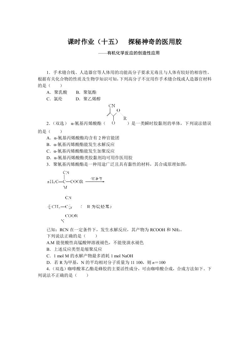 学生啦:课时作业(十五)探秘神奇的医用胶—有机化学反应的创造性应用1,手术缝合线、人造器官等人体用的功能高分子要求无毒且与人体有较好的相容性。根据有关化合物的性质及生物学知识可知,下列高分子不宜用作手术缝合线或人造器宫材料的是()B.聚氨酯C.氯纶D.聚乙烯醇CN)是一类瞬时胶黏剂的单体,下列说法错误A.α-氰基丙烯酸酯均含有2种官能团B.-氧基丙烯酸酯能发生水解反应C.α-氰基丙烯酸酯能发生加聚反应D.-氰基丙烯酸酯类胶黏剂均可用作医用胶3.聚氰基丙烯酸酯是一种用途广泛且具有黏性的材料,其合成原理如图:CyCN已知:RCN在一定条件下,发生水解反应,其产物为RCOOH和NH。下列说法正确的是()AM能使酸性高锰酸钾溶液褪色,不能使溴水褪色B.上述反应类型是缩聚反应C.1molM的水解产物最多消耗1 mol NaOHD.若R为甲基,N的平均相对分子质量为11100,则n=1004.(双选)咖啡酸苯乙酯是蜂胶的主要活性成分,可由咖啡酸合成,合成方法如下。下列说法不正确的是()