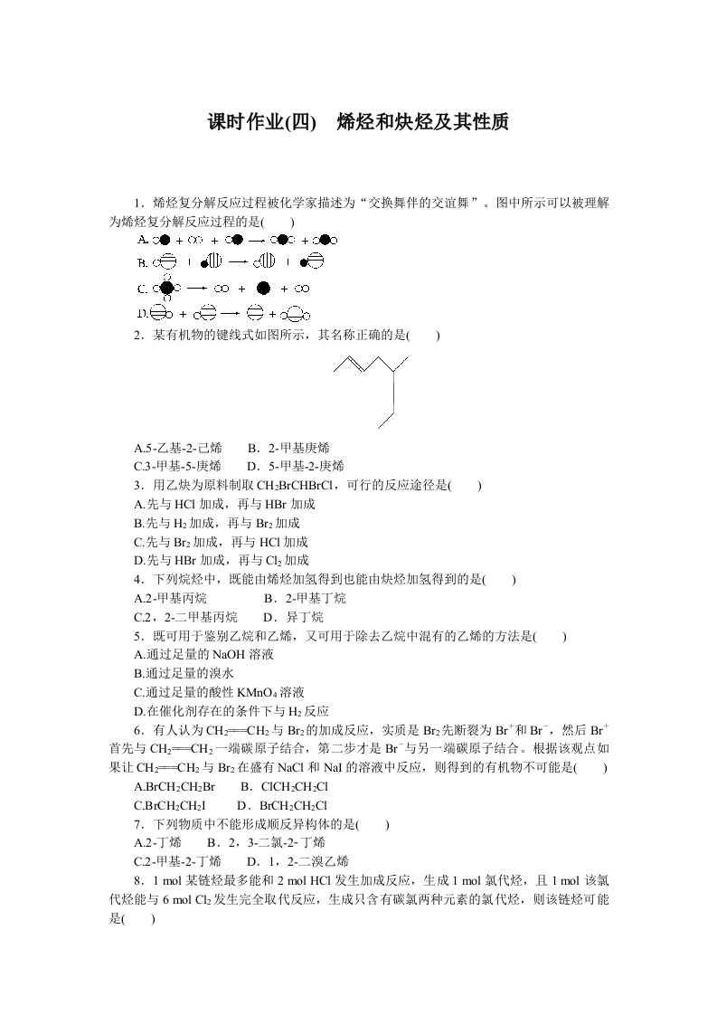 学生啦:课时作业(四)烯烃和炔烃及其性质1.烯烃复分解反应过程被化学家描述为“交换舞伴的交谊舞”。图中所示可以被理解为烯烃复分解反应过程的是()2.某有机物的键线式如图所示,其名称正确的是(A.5-乙基-2-己烯B.2-甲基庚烯C.3甲基-5-庚烯D.5-甲基-2-庚烯3.用乙炔为原料制取CH2BrCHBrCl,可行的反应途径是(A.先与HCI加成,再与HBr加成B.先与H加成,再与B2加成C.先与Br2加成,再与HCI加成D.先与HBr加成,再与Cl2加成4.下列烷烃中,既能由烯烃加氢得到也能由炔烃加氢得到的是()B.2甲基丁烷C2,2-二甲基丙烷D.异丁烷5.既可用于鉴别乙烷和乙烯,又可用于除去乙烷中混有的乙烯的方法是()A.通过足量的NaOH溶液B.通过足量的溴水C.通过足量的酸性KMnO,溶液D.在催化剂存在的条件下与H2反应6.有人认为CH2CH与Br2的加成反应,实质是Br先断裂为Br和Br,然后Br首先与CH2一CH2一端碳原子结合,第二步才是Br与另一端碳原子结合。根据该观点如果让CH一CH与Br2在盛有NaCI和Nal的溶液中反应,则得到的有机物不可能是()7.下列物质中不能形成顺反异构体的是(A.2-丁烯B.2,3-二氯-2丁烯C2.甲基-2-丁烯D.1,2-二溴乙烯8.1mol某链烃最多能和2 mol HC1发生加成反应,生成1mol氯代烃,且1mol该氯代烃能与6molC12发生完全取代反应,生成只含有碳氯两种元素的氯代烃,则该链烃可能是()