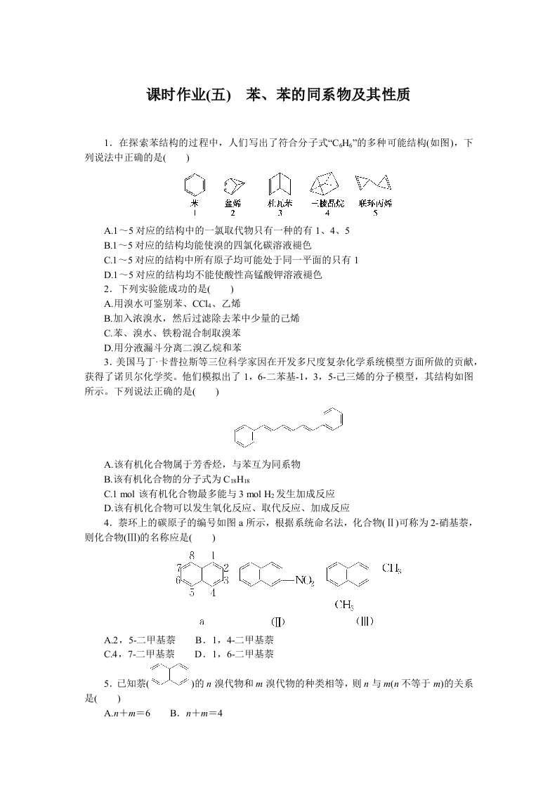 学生啦:课时作业(五)苯、苯的同系物及其性质1.在探索苯结构的过程中,人们写出了符合分子式“℃H6”的多种可能结构(如图),下列说法中正确的是()34A.1~5对应的结构中的一氯取代物只有一种的有1、4、5B.1一5对应的结构均能使溴的四氯化碳溶液褪色C.1~5对应的结构中所有原子均可能处于同一平面的只有1D.1~5对应的结构均不能使酸性高锰酸钾溶液褪色2.下列实验能成功的是()A.用溴水可鉴别苯、CC4、乙烯B.加入浓溴水,然后过滤除去苯中少量的己烯C.苯、溴水、铁粉混合制取溴苯D.用分液漏斗分离二溴乙烷和苯3.美国马丁·卡普拉斯等三位科学家因在开发多尺度复杂化学系统模型方面所做的贡献,获得了诺贝尔化学奖。他们模拟出了1,6-二苯基1,3,5-己三烯的分子模型,其结构如图所示。下列说法正确的是()A.该有机化合物属于芳香烃,与苯互为同系物B.该有机化合物的分子式为C1sH1sC.1mol该有机化合物最多能与3olH2发生加成反应D.该有机化合物可以发生氧化反应、取代反应、加成反应4.萘环上的碳原子的编号如图a所示,根据系统命名法,化合物(Ⅱ)可称为2-硝基萘,则化合物(Ⅲ的名称应是(NCH()()B.1,4二甲基紫D.1,6二甲基萘5.已知萘(人)的n溴代物和m溴代物的种类相等,则n与m(n不等于m)的关系A.n+m=6B.n十m=4