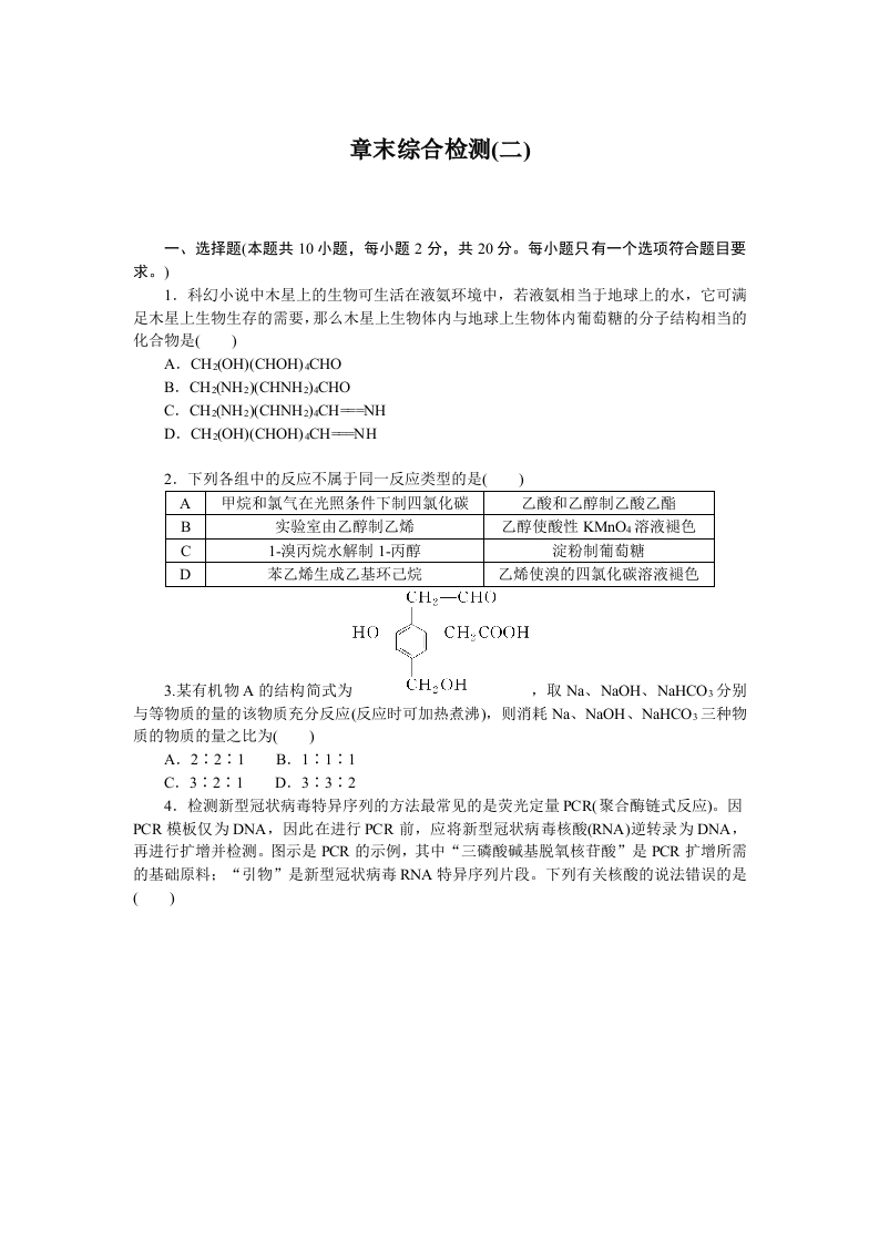 学生啦:章末综合检测(二)一、选择题(本题共10小题,每小题2分,共20分。每小题只有一个选项符合题目要求。)1.科幻小说中木星上的生物可生活在液氨环境中,若液氨相当于地球上的水,它可满足木星上生物生存的需要,那么木星上生物体内与地球上生物体内葡萄糖的分子结构相当的化合物是()A.CH2(OH)(CHOH)CHOB.CH2(NH2)(CHNH2)CHOC.CH2(NH2)(CHNH2)4CH-NHD.CH (OH)(CHOH)CH-NH2.下列各组中的反应不属于同一反应类型的是(甲烷和氯气在光照条件下制四氯化碳乙酸和乙醇制乙酸乙酯B实验室由乙醇制乙烯乙醇使酸性KMnO:溶液褪色C1-溴丙烷水解制1-丙醇淀粉制葡萄糖D苯乙烯生成乙基环己烷乙烯使溴的四氯化碳溶液褪色HOCH COOH3.某有机物A的结构简式为,取Na、NaOH、NaHCO3分别与等物质的量的该物质充分反应(反应时可加热煮沸),则消耗Na、NaOH、NaHCO3三种物质的物质的量之比为()A.2:2:1B.1:1:1C.3:2:1D.3:3:24.检测新型冠状病毒特异序列的方法最常见的是荧光定量P℃R(聚合酶链式反应)。因PCR模板仅为DNA,因此在进行PCR前,应将新型冠状病毒核酸RNA)逆转录为DNA,再进行扩增并检测。图示是PCR的示例,其中“三磷酸碱基脱氧核苷酸”是PCR扩增所需的基础原料:“引物”是新型冠状病毒RNA特异序列片段。下列有关核酸的说法错误的是()