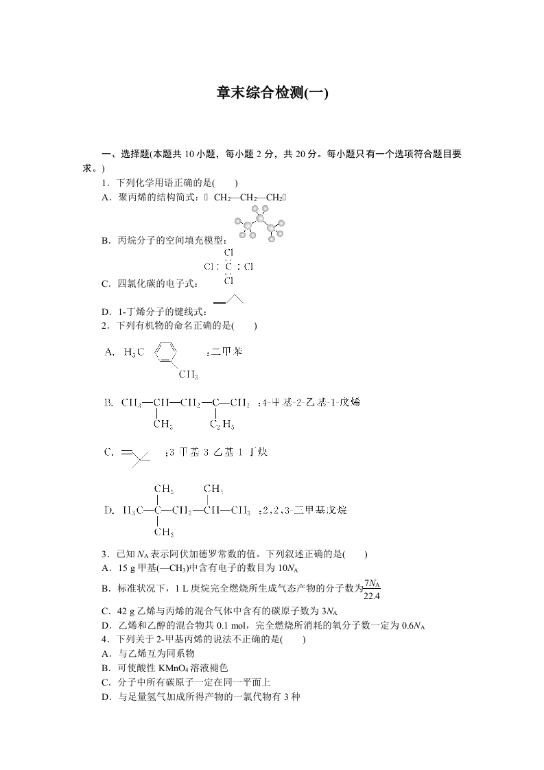 学生啦:章末综合检测(一)一、选择题(本题共10小题,每小题2分,共20分。每小题只有一个选项符合题目要求。)1.下列化学用语正确的是()0B.丙烷分子的空间填充模型:C.四氯化碳的电子式:CID.1-丁烯分子的键线式:2.下列有机物的命名正确的是()C.=CHCHCH:3.己知Na表示阿伏加德罗常数的值。下列叙述正确的是()A.15g甲基(CH)中含有电子的数目为10NaB.标准状况下,1L庚烷完全燃烧所生成气态产物的分子数为7心C.42g乙烯与丙烯的混合气体中含有的碳原子数为3ND.乙烯和乙醇的混合物共0.1mol,完全燃烧所消耗的氧分子数一定为0.6WA4.下列关于2甲基丙烯的说法不正确的是()A.与乙烯互为同系物B.可使酸性KMnOa溶液褪色C.分子中所有碳原子一定在同一平面上D.与足量氢气加成所得产物的一氯代物有3种