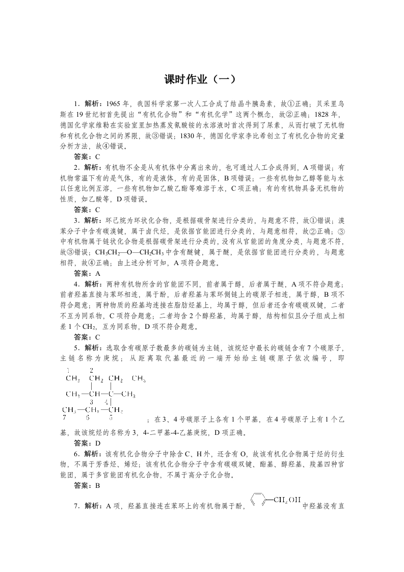 学生啦:课时作业(一)1.解析:1965年,我国科学家第一次人工合成了结晶牛胰岛素,故①正确:贝采里鸟斯在19世纪初首先提出“有机化合物”和“有机化学”这两个概念,故②正确;1828年,德国化学家维勒在实验室里加热蒸发氰酸铵的水溶液时首次得到了尿素,从而打破了无机物和有机化合物之间的界限,故③错误;1830年,德国化学家李比希创立了有机化合物的定量分析方法,故④错误。答案:C2.解析:有机物不全是从有机体中分离出来的,也可通过人工合成得到,A项错误;有机物常温下有的是气体,有的是液体,有的是固体,B项错误;一些有机物如乙醇等能与水以任意比例互溶,一些有机物如乙酸乙酯等难溶于水,C项正确;有的有机物具备无机物的性质,如乙酸等,D项错误。答案:C3.解析:环己烷为环状化合物,是根据碳骨架进行分类的,与题意不符,故①错误;澳苯分子中含有碳澳键,属于卤代烃,是依据官能团进行分类的,与题意相符,故②正确;③中有机物属于链状化合物是根据碳骨架进行分类的,没有从官能团的角度分类,与题意不符,故③错误;CH;CH2O-CH2CH3中含有醚键,属于醚,是依据官能团进行分类的,与题意相符,故④正确:由上述分析可知,A项符合题意,答案:A4.解析:两种有机物所含的官能团不同,前者属于醇,后者属于醚,A项不符合题意:前者羟基直接与苯环相连,属于酚,后者羟基与苯环侧链上的碳原子相连,属于醇,B项不符合题意;两种物质的羟基均连接在脂肪烃基上,均属于醇,但后者还含有碳碳双键,二者不互为同系物,C项符合题意;二者均含2个醇羟基,均属于醇,结构相似且分子组成上相差1个CH2,互为同系物,D项不符合题意,答案:C5,解析:选取含有碳原子数最多的碳链为主链,该烷烃中最长的碳链含有7个碳原子,主链名称为庚烷;从距离取代基最近的一端开始给主链碳原子依次编号,即1CH-CH-(-CHsCH:-CH,-CH2;在3、4号碳原子上各有1个甲基,在4号碳原子上有1个乙基,故该烷烃的名称为3,4二甲基4乙基庚烷,D项正确。答案:D6.解析:该有机化合物分子中除含C、H外,还含有O,故该有机化合物属于烃的衍生物,不属于芳香烃、烯烃;该有机化合物分子中含有碳碳双键、酯基、醇羟基、羧基四种官能团,属于多官能团有机化合物,不属于高分子化合物,答案:B7.解析:A项,羟基直接连在苯环上的有机物属于酚,中羟基没有直