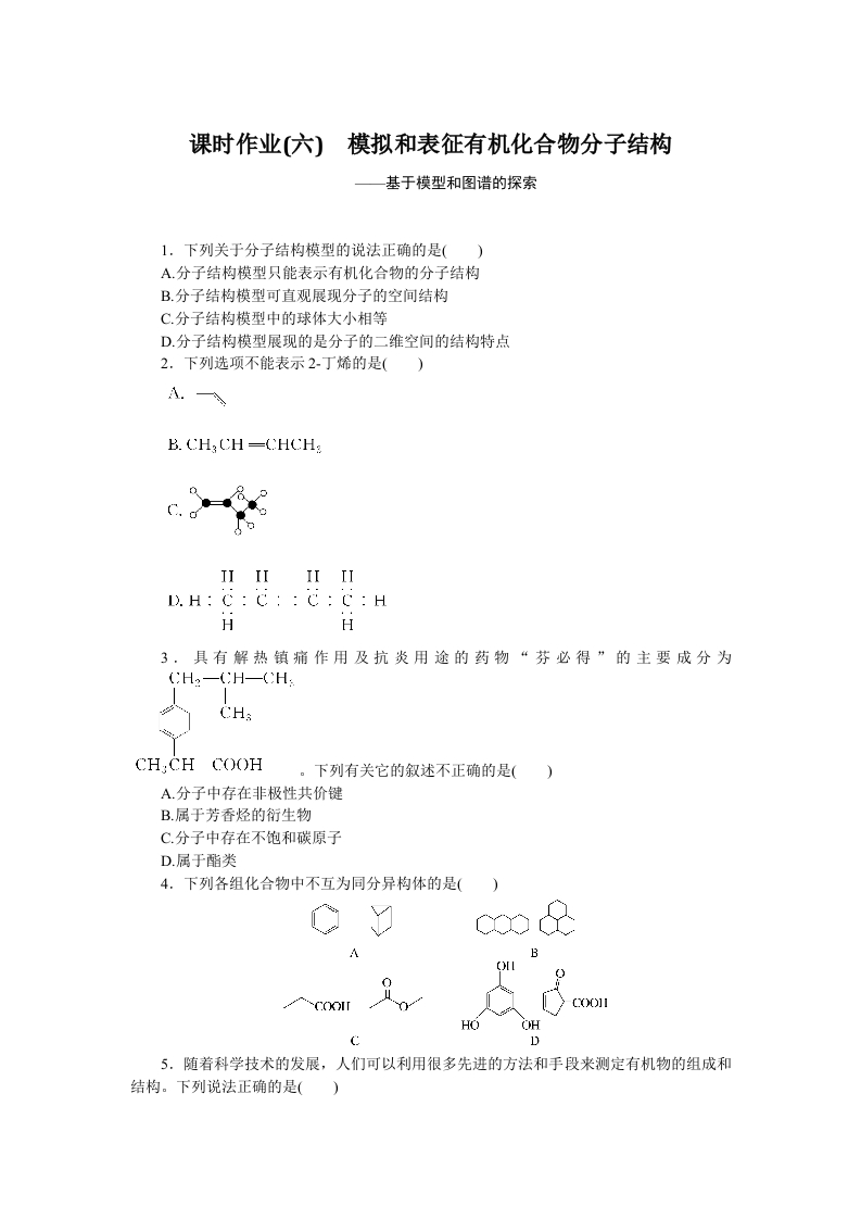 学生啦:课时作业(六)模拟和表征有机化合物分子结构基于模型和图谱的探索1.下列关于分子结构模型的说法正确的是()A.分子结构模型只能表示有机化合物的分子结构B.分子结构模型可直观展现分子的空间结构C.分子结构模型中的球体大小相等D.分子结构模型展现的是分子的二维空间的结构特点2.下列选项不能表示2丁烯的是()A.B.CH:CH=CHCHII II II IIH3,具有解热镇痛作用及抗炎用途的药物“芬必得”的主要成分为HCH;CH COOH。下列有关它的叙述不正确的是(A.分子中存在非极性共价键B.属于芳香烃的衍生物C.分子中存在不饱和碳原子D.属于酯类4.下列各组化合物中不互为同分异构体的是(BHOD5.随着科学技术的发展,人们可以利用很多先进的方法和手段来测定有机物的组成和结构。下列说法正确的是()