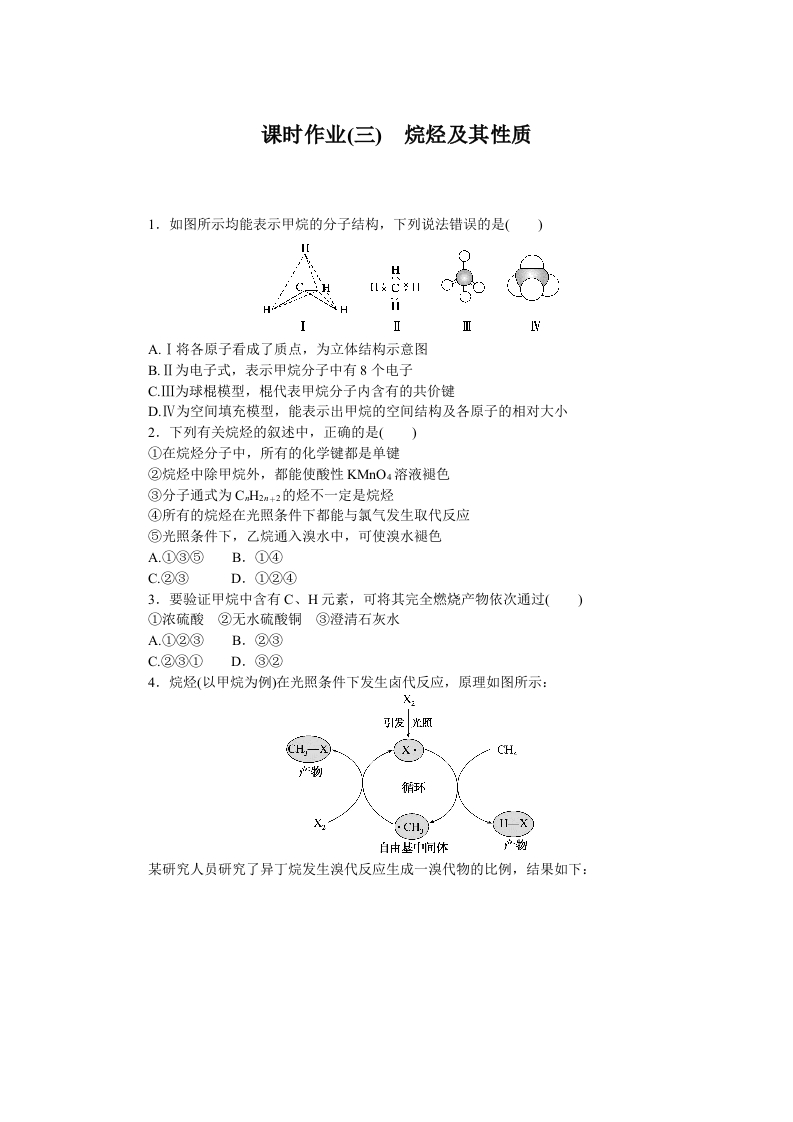 学生啦:课时作业(三)烷烃及其性质1.如图所示均能表示甲烷的分子结构,下列说法错误的是()IHIA.I将各原子看成了质点,为立体结构示意图B.Ⅱ为电子式,表示甲烷分子中有8个电子C.I为球棍模型,棍代表甲烷分子内含有的共价键D.V为空间填充模型,能表示出甲烷的空间结构及各原子的相对大小2.下列有关烷烃的叙述中,正确的是()①在烷烃分子中,所有的化学键都是单键②烷烃中除甲烷外,都能使酸性KMnO4溶液褪色③分子通式为CH2m+2的烃不一定是烷烃④所有的烷烃在光照条件下都能与氯气发生取代反应⑤光照条件下,乙烷通入溴水中,可使溴水褪色B.①④D.①②④3.要验证甲烷中含有C、H元素,可将其完全燃烧产物依次通过()①浓硫酸②无水硫酸铜③澄清石灰水A.①②③B.②③D.③②4.烷烃(以甲烷为例)在光照条件下发生卤代反应,原理如图所示:X:CH.物某研究人员研究了异丁烷发生溴代反应生成一溴代物的比例,结果如下: