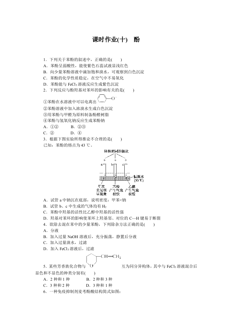 学生啦:课时作业(十)酚1.下列关于苯酚的叙述中,正确的是()A.苯酚呈弱酸性,能使紫色石蕊试液显浅红色B.向少量苯酚溶液中滴加饱和溴水,可观察到白色沉淀C.苯酚的化学性质稳定,在空气中不易氧化D.苯酚能与FcCI,溶液反应生成紫色沉淀2.下列反应与酚羟基对苯环的影响有关的是(①苯酚在水溶液中可以电离出一②苯酚溶液中加入浓溴水生成白色沉淀③用苯酚与甲醛为原料制备酚醛树脂④苯酚与氢氧化钠反应生成苯酚钠A.①②B.②③C.②D.④3.根据下图实验所得推论不合理的是()已知:苯酚的熔点为43℃。A.试管a中钠沉在底部,说明密度:甲苯<钠B.试管b、c中生成的气体均有H2C.苯酚中羟基的活性比乙醇中羟基的活性强D.轻基对苯环的影响使苯环上羟基邻、对位的C一H键易于断裂4.欲除去混在苯中的少量苯酚,下列除杂方法正确的是()A.分液B.加入过量NaOH溶液后,充分振荡,静置后分液C.加入过量溴水,过滤D.加入FeCl3溶液后,过滤(H-H25.某些芳香族化合物与互为同分异构体,其中与FcC1s溶液混合后显色和不显色的种类分别有(A.2种和1种B.2种和3种C.3种和2种D.3种和1种6.一种免疫抑制剂麦考酚酸结构简式如图: