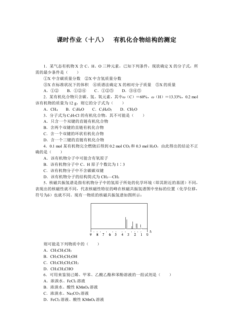 学生啦:课时作业(十八)有机化合物结构的测定1.某气态有机物X含C、H、O三种元素,己知下列条件,现欲确定X的分子式,所需的最少条件是()①X中含碳质量分数②X中含氢质量分数③X在标准状况下的体积④质谱法确定X的相对分子质量⑤X的质量A.①②B.①②④C.①②⑤D.③④⑤2.某有机化合物只含碳、氢、氧元素,其中w(C)=60%,w(H)=13.33%,0.2mol该有机物的质量为12g,则它的分子式为()A.CH4 B.C3HsO C.C2H4O2 D.CH2O3.分子式为CsHC1的有机化合物,其不可能是()A.只含一个双键的直链有机化合物B.含两个双键的直链有机化合物C.含一个双键的环状有机化合物D.含一个三键的直链有机化合物4.0.1mol某有机物完全燃烧后得到0.2molC02和0.3molH0,由此得出的结论不正A.该有机物分子中可能含有氧原子B.该有机物分子中C、H原子个数比为1:3C.该有机物分子中不含碳碳双键D.该有机物分子的结构简式为CHCH5.核磁共振氢谱是指有机物分子中的氢原子所处的化学环境(即其附近的基团)不同,表现出的核磁性就不同,代表核磁性特征的峰在核磁共振氢谱图中坐标的位置(化学位移,符号为8)也就不同。现有一物质的核磁共振氢谱如图所示:则可能是下列物质中的()B.CH:CH-CHOHD.CHCH-CHO6.可用来鉴别己烯、甲苯、乙酸乙酯和苯酚溶液的一组试剂是()A.浓溴水、FeCls溶液B.浓溴水、酸性KMnO4溶液