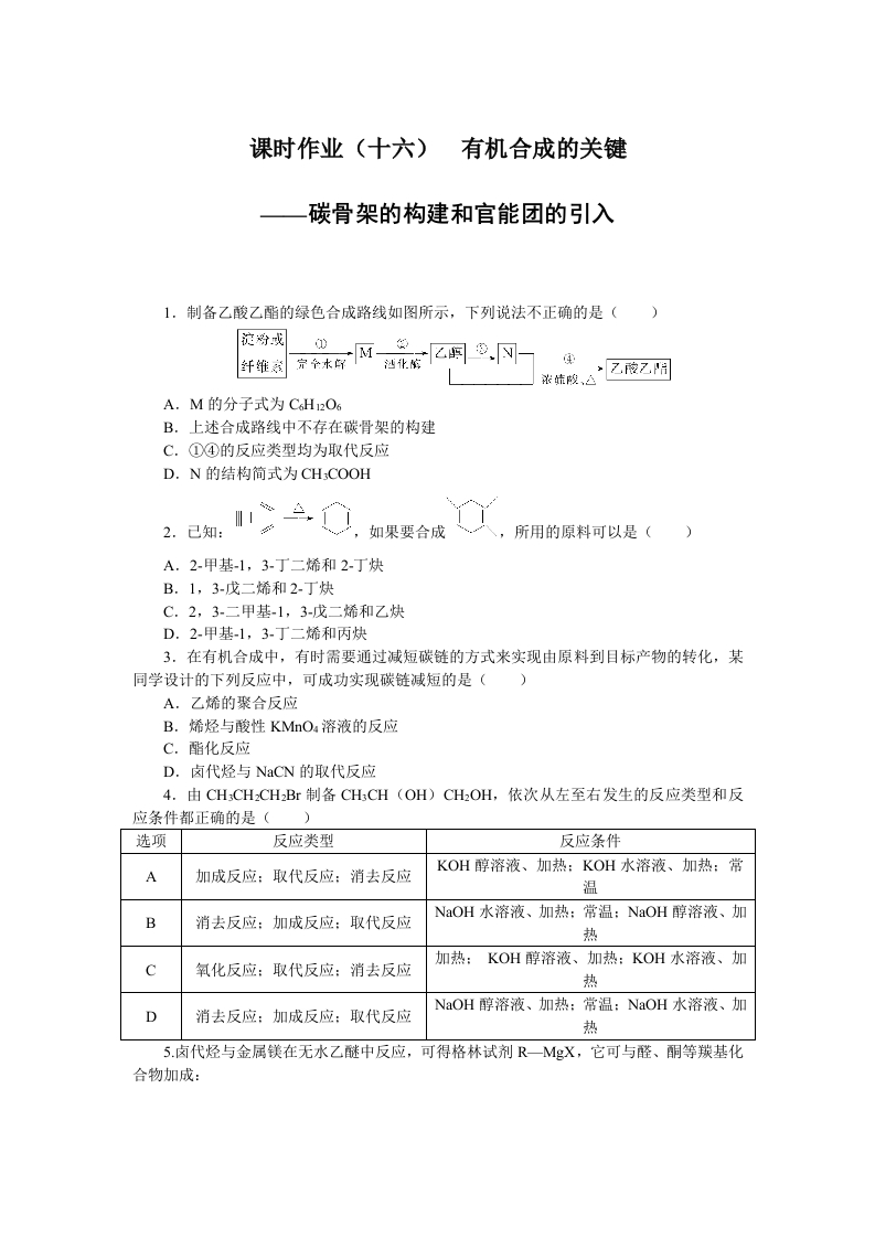 学生啦:课时作业(十六)有机合成的关键碳骨架的构建和官能团的引入1.制备乙酸乙酯的绿色合成路线如图所示,下列说法不正确的是()A.M的分子式为C6H12O6B.上述合成路线中不存在碳骨架的构建C.①④的反应类型均为取代反应2.已知:如果要合成所用的原料可以是()B.1,3-戊二烯和2丁炔C.2,3-二甲基-1,3-戊二烯和乙炔D.2甲基-1,3-丁二烯和丙炔3.在有机合成中,有时需要通过减短碳链的方式来实现由原料到目标产物的转化,某同学设计的下列反应中,可成功实现碳链减短的是()A.乙烯的聚合反应B.烯烃与酸性KMnO4溶液的反应C.酯化反应D.卤代烃与NaCN的取代反应4.由CH:CH2CH2Br制备CHCH(OH)CHOH,依次从左至右发生的反应类型和反应条件都正确的是(选项反应类型反应条件KOH醇溶液、加热:KOH水溶液、加热:常A加成反应:取代反应:消去反应温B消去反应:加成反应:取代反应NaOH水溶液、加热:常温:NaOH醇溶液、加热加热:KOH醇溶液、加热:KOH水溶液、加氧化反应:取代反应:消去反应热NaOH醇溶液、加热:常温:NaOH水溶液、加消去反应:加成反应:取代反应热5.卤代烃与金属镁在无水乙醚中反应,可得格林试剂R一MgX,它可与醛、酮等羰基化合物加成:
