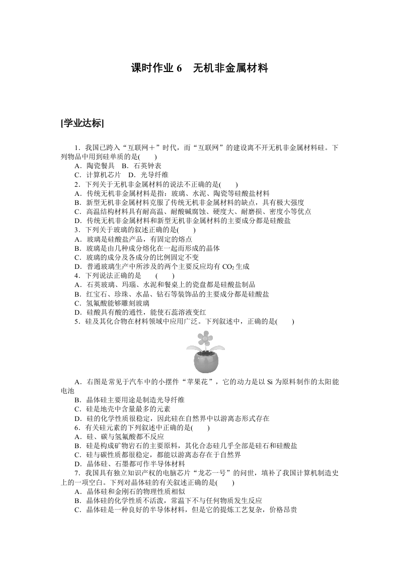 学生啦:课时作业6无机非金属材料[学业达标1.我国己跨入“互联网十”时代,而“互联网”的建设离不开无机非金属材料硅。下列物品中用到硅单质的是()A.陶瓷餐具B.石英钟表C.计算机芯片D.光导纤维2.下列关于无机非金属材料的说法不正确的是()A.传统无机非金属材料是指:玻璃、水泥、陶瓷等硅酸盐材料B.新型无机非金属材料克服了传统无机非金属材料的缺点,具有极大强度C.高温结构材料具有耐高温、耐酸碱腐蚀、硬度大、耐磨损、密度小等优点D.传统无机非金属材料和新型无机非金属材料的主要成分都是硅酸盐3.下列关于玻璃的叙述正确的是()A.玻璃是硅酸盐产品,有固定的熔点B.玻璃是由几种成分熔化在一起而形成的晶体C.玻璃的成分及各成分的比例固定不变D.普通玻璃生产中所涉及的两个主要反应均有CO2生成4.下列说法正确的是()A,石英玻璃、玛瑙、水泥和餐桌上的瓷盘都是硅酸盐制品B.红宝石、珍珠、水晶、钻石等装饰品的主要成分都是硅酸盐C.氢氟酸能够雕刻玻璃D.硅酸具有酸的通性,能使石蕊溶液变红5.硅及其化合物在材料领域中应用广泛。下列叙述中,正确的是()A.右图是常见于汽车中的小摆件“苹果花”,它的动力是以S为原料制作的太阳能电池B.晶体硅主要用途是制造光导纤维C.硅是地壳中含量最多的元素D.硅的化学性质很稳定,因此硅在自然界中以游离态形式存在6.有关硅元素的下列叙述中正确的是(A,硅、碳与氢氟酸都不反应B.硅是构成矿物岩石的主要原料,其化合态硅几乎全部是硅石和硅酸盐C.硅与碳性质都很稳定,都能以游离态存在于自然界D.晶体硅、石墨都可作半导体材料7.我国具有独立知识产权的电脑芯片“龙芯一号”的问世,填补了我国计算机制造史上的一项空白。下列对晶体硅的有关叙述正确的是()A,晶体硅和金刚石的物理性质相似B.晶体硅的化学性质不活泼,常温下不与任何物质发生反应C.晶体硅是一种良好的半导体材料,但是它的提炼工艺复杂,价格昂贵
