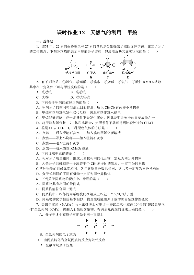 学生啦:课时作业12天然气的利用甲烷一、选择题1.1874年,22岁的范特霍夫和27岁的勒贝尔分别提出了碳四面体学说,建立了分子的立体概念。下列各项均能表示甲烷的分子结构,但最能反映其真实状况的是()H-H九了式2.有下列物质:①氯气:②硝酸:③溴水:④烧碱:⑤氧气:©酸性KMnO4溶液,其中在一定条件下可与甲烷反应的是(A.①②③B.④⑤©3.下列关于甲烷的叙述正确的是(A.甲烷分子的空间构型是正四面体形,所以CH2C2有两种不同构型B.甲烷可以与氯气发生取代反应,因此可以使氯水褪色C.甲烷能够燃烧,在一定条件下会发生爆炸,因此是矿井安全的重要威胁之一D.将甲烷与氯气按1:1体积比混合,光照条件下就可得到比较纯净的CHCI4.鉴别CH4、CO、H2三种无色气体的方法是()A.点燃—通入澄清石灰水—加入溴的四氯化碳溶液B.点燃一罩上小烧杯—加入澄清石灰水C.点燃—通入澄清石灰水D.点燃—通入酸性KMnO:溶液5.下列说法中正确的是()A.相对分子质量相同,组成元素也相同的化合物一定互为同分异构体B.凡是分子组成相差一个或若干个CH原子团的物质,一定互为同系物C两种物质的组成元素相同,各元素质量分数也相同,则二者一定互为同分异构体D.分子式相同的不同有机物一定互为同分异构体6.下列关于同系物的说法中,错误的是()A.同系物具有相同的最简式B.同系物能符合同一通式C.同系物中,相邻的同系物彼此在组成上相差一个“CH2”原子团D.同系物的化学性质基本相似,物理性质随碳原子数增加而呈规律性变化7.美国宇航局(NASA)马里诺娃博士发现了一种比二氧化碳高10倍的“超级温室气体”全氟丙烷(CFg),提醒人们慎用含氟物。有关全氟丙烷的说法正确的是()A.分子中3个碳原子可能处于同一直线上B.全氟丙烷的电子式为C.由丙烷转化为全氟丙烷的反应为取代反应D.全氟丙慌属于烷烃
