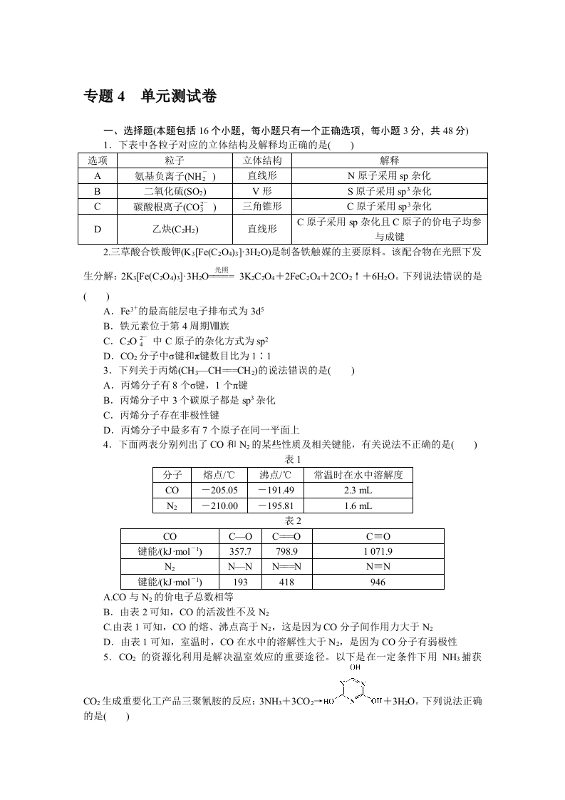苏教版化学选择性必修2专题4 单元测试卷